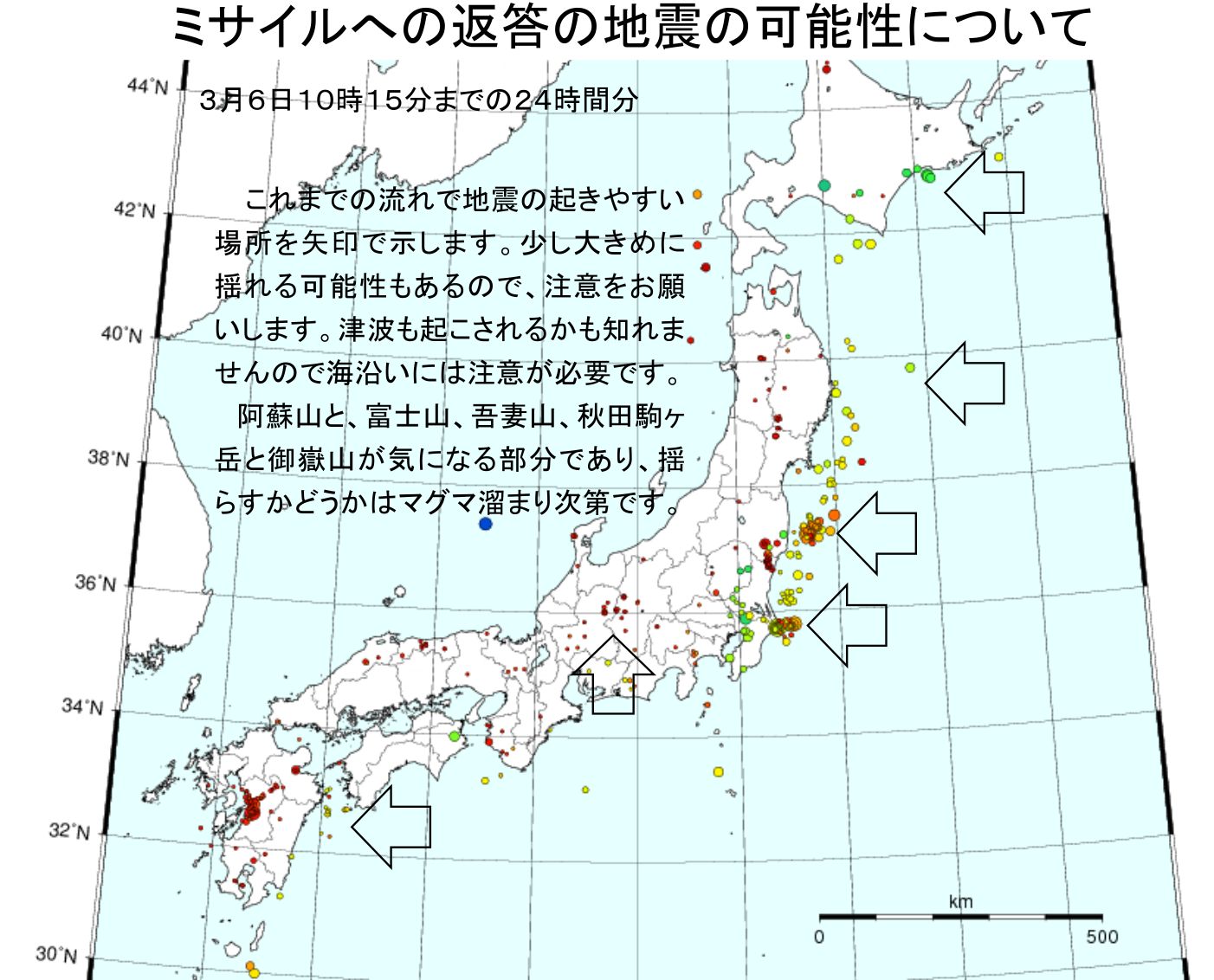 3月6日に北朝鮮のミサイル発射が起きた事で、関連する返事の地震が起きる可能性が高まりました。