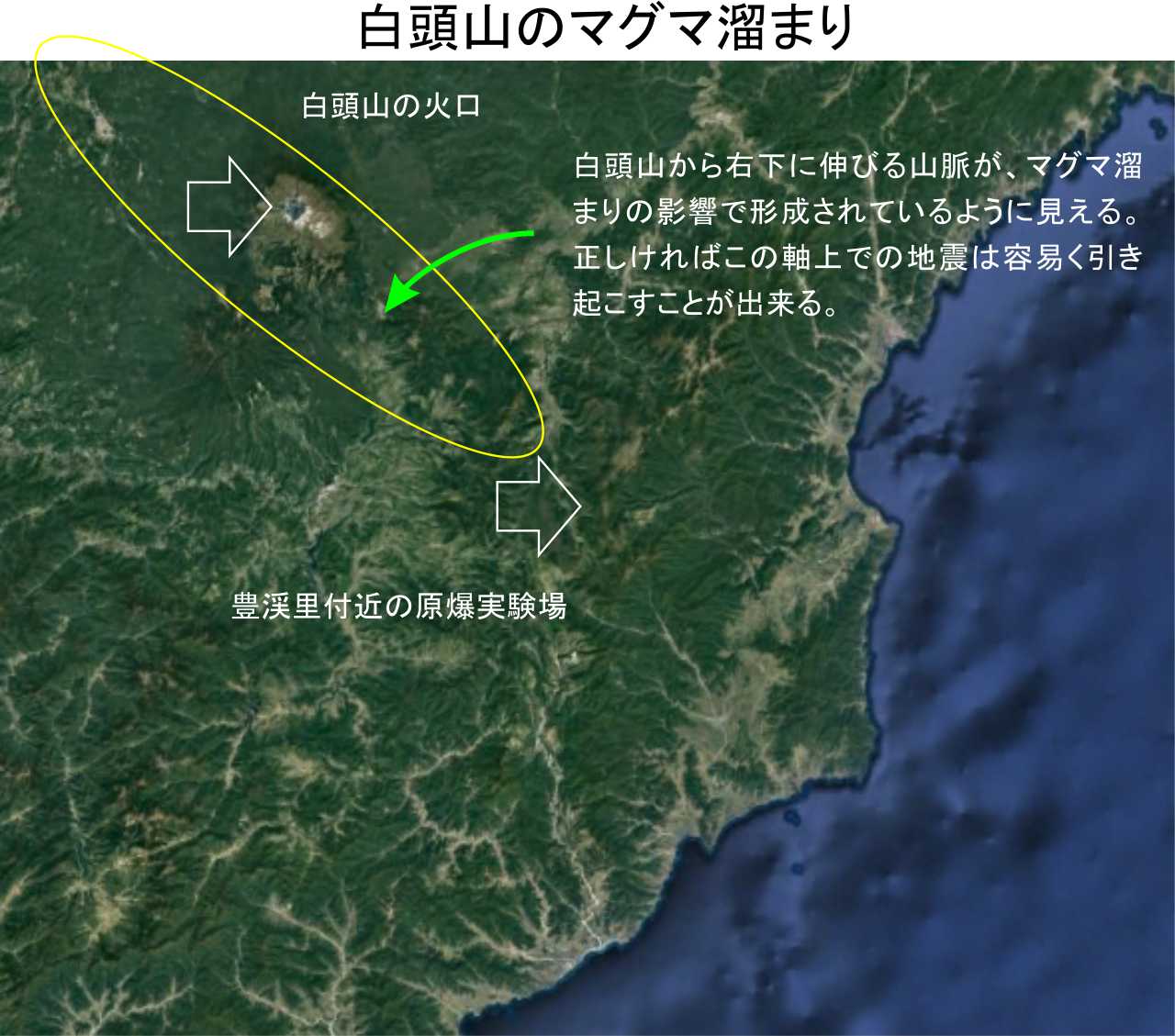 この意味ですが、白頭山から原爆実験施設まで約110kmです。この距離ですと大きな地震を白頭山が起こすと実験施設を一部損傷できるでしょう。マグマ溜まりの軸線が明確ではないので分かりにくいですが、地形的には軸線上に見えており統計に足る地震の観測回数が少ないだけです。見立てが正しければ実験施設にM5クラスの地震を起こすことは容易く、トンネルに損傷を与えることも出来るでしょう。