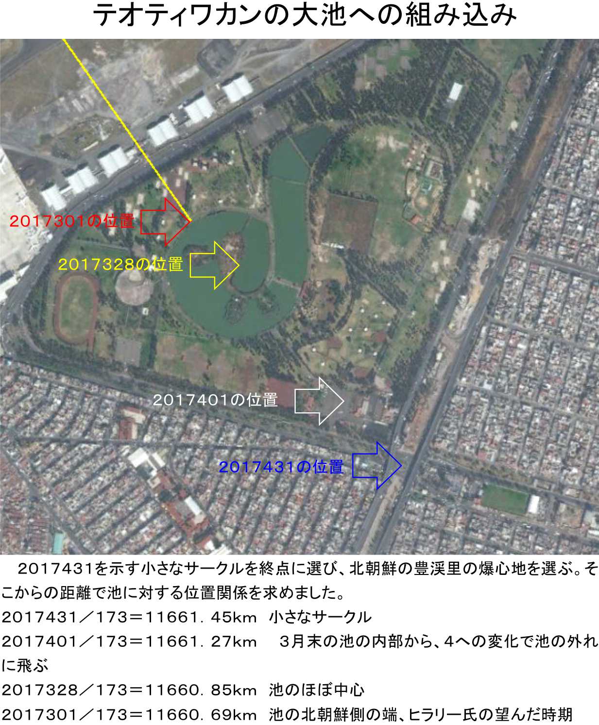 もちろん豊渓里の起点をずらせば大池に収まる修正も可能になりますし、2017328と2017431のずれもテオティワカンの位置では600mです。これだと爆心地の位置を600m変えれば良いので、しばらくこの変化にも可能性は残ります。相応しいトンネルが残っていれば検討するでしょう。