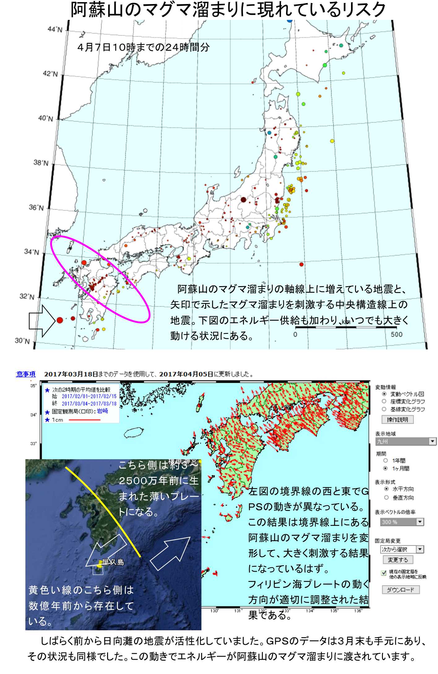 記事をアップしようとしたところ、フィリピンでM5.9~4.7の地震が4回ほど続いていることが分かりました。16時過ぎからの地震です。フィリピン海プレートの西側の動きを促す物なので、阿蘇山の動きをサポートする物である可能性がある所です。本日深夜には最大震度の地震の意味を解析できると思います。内容次第で朝になるかも知れませんが、結果を改めて公表したいと思います。