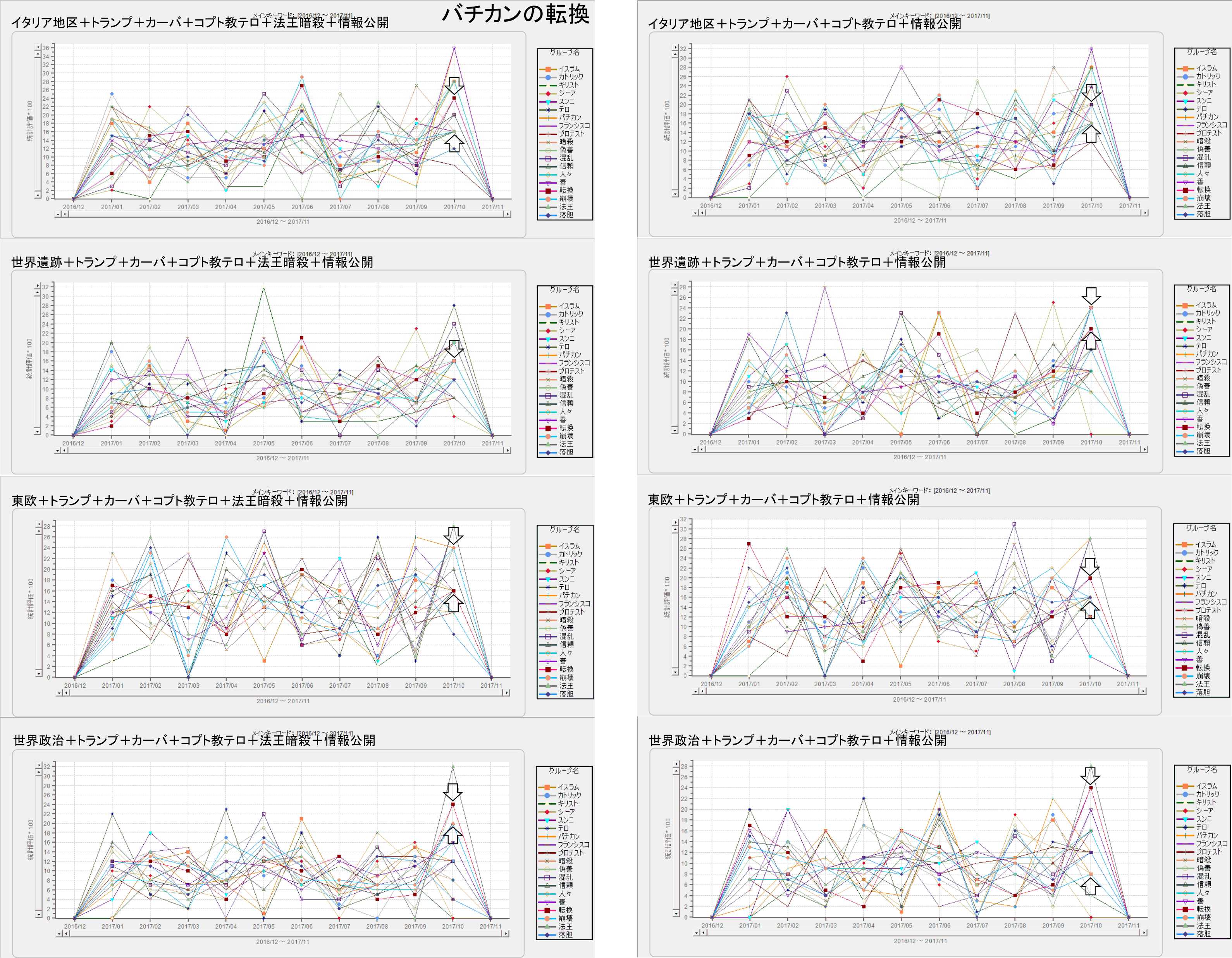 グラフの条件にはトランプ大統領、カーバの登場、コプト教へのテロ、法王暗殺とその後の遺跡と自然の情報公開までを含んでいます。紹介するグラフは法王暗殺とその後の情報公開までを含む二種類です。