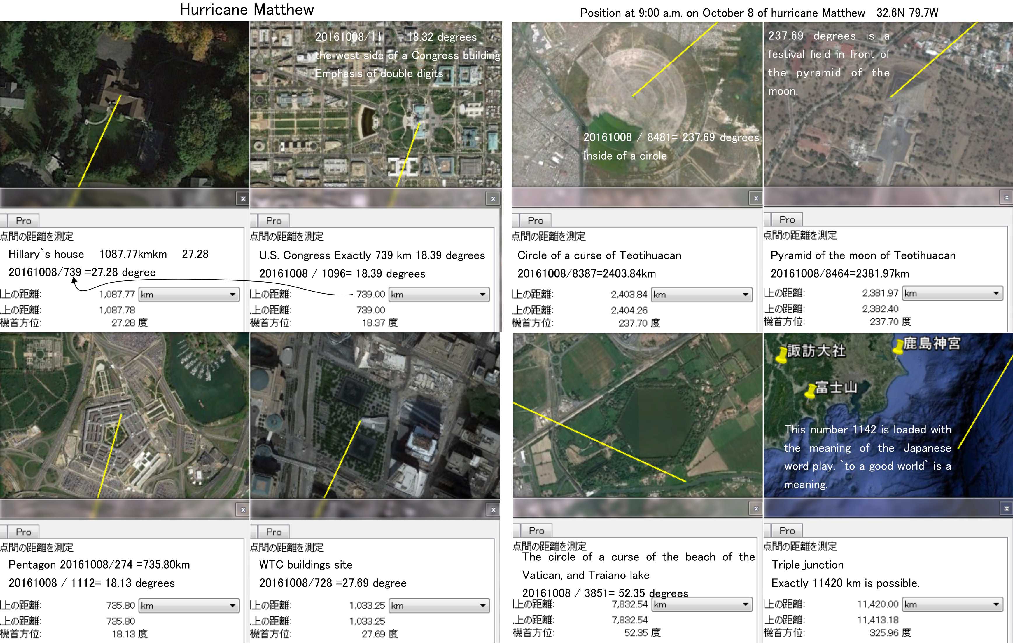 続いて2016年10月4日にハイチ付近を通過して死者1000人以上、10月7日にはフロリダで21人の死者を出しているハリケーンマシューの解析結果です。このハリケーンは20161008における日本の阿蘇山の噴火に対する応答になっていました。ヒラリー氏の大統領就任を望む偽善の側の動かしたハリケーンでした。