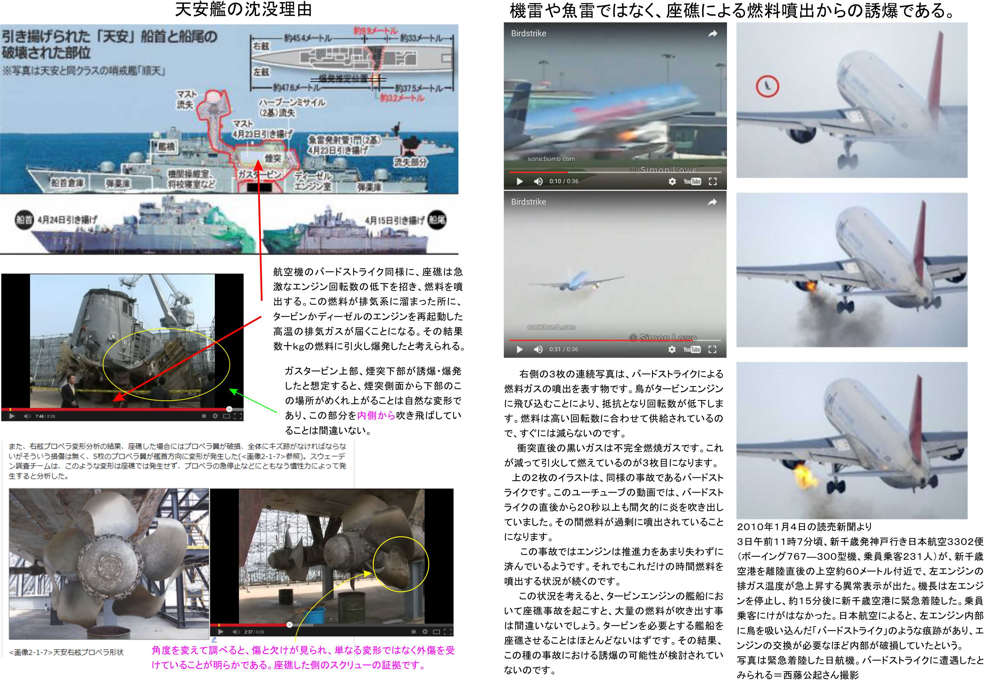 인터넷상에는 다른 각도에서 본 동영상이 있었습니다. 분명히 뭔가에 부딪혀 변형된 부분도 있어 보고서의 설명과 모순되어 있습니다. 권력자의 노골적인 거짓말이지만 군 내부에서는 그 누구도 비판할 수 없는 부분이겠지요.