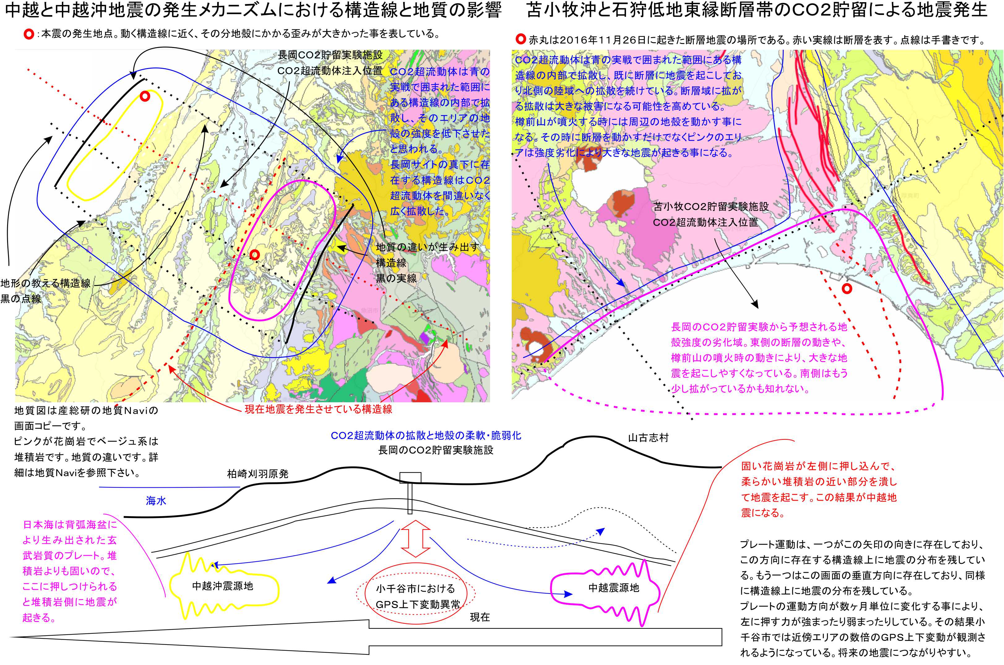 2017年の5月に中越と中越沖の地震の発震メカニズムを知る所に進んで来ています。GPS変動データーの異常と、1ヶ月分の震源地データーに構造線の動きを表す地震列が現れたことで、これまで明確でなかった長岡のCO2貯留実験が引きおこした中越と中越沖の地震がなぜ実験施設から15km、22km離れているのを説明出来るようになりました。前兆もある程度明確に出来ており、今後に生かせる所です。