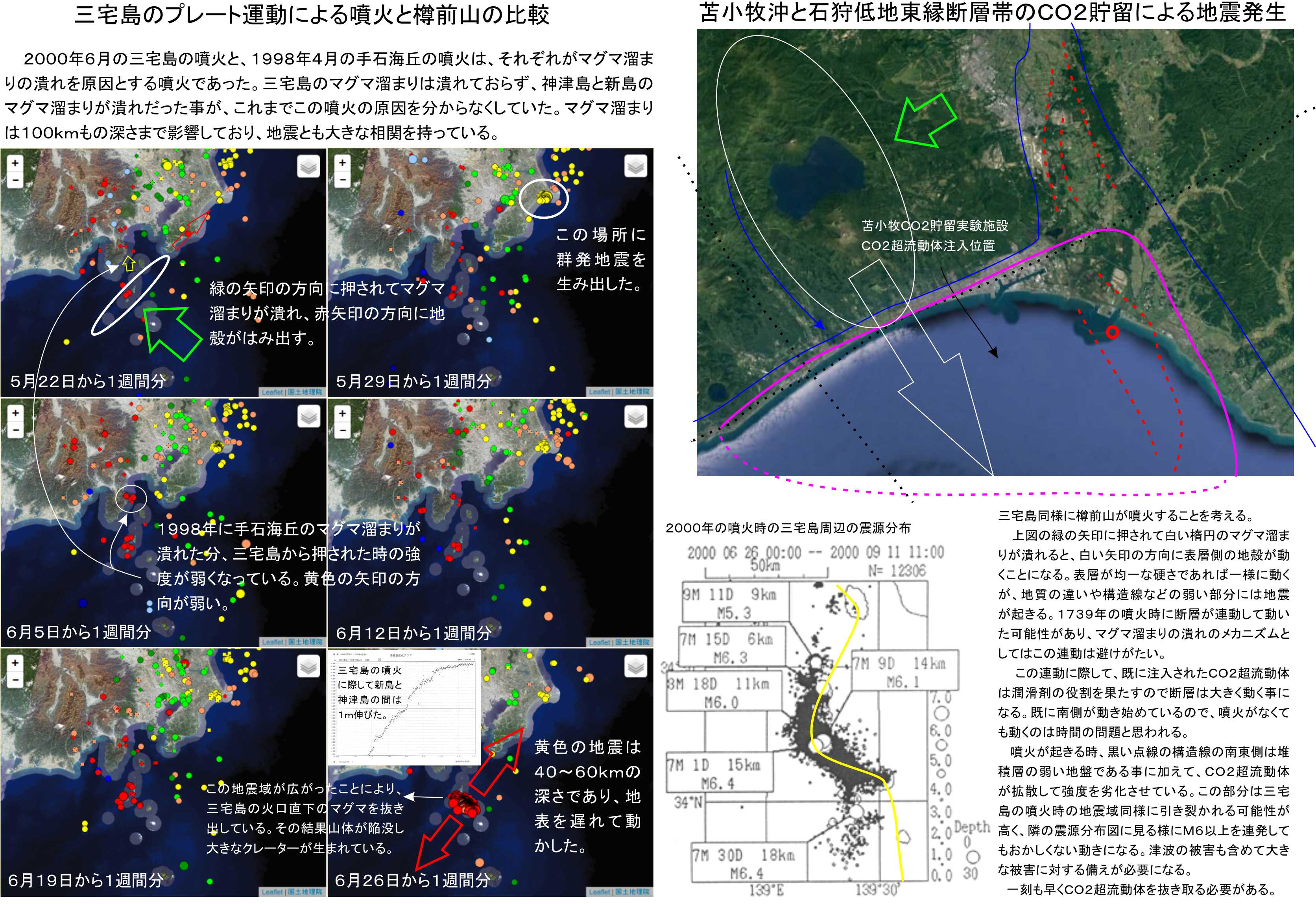 この時は潰れたマグマ溜まりが新島・神津島の物でした。これが理由で三宅島が噴火するという状況は理解しにくかったのでしょう。メカニズムはこの潰れにより表層地殻が裂けて動いたことで、その裂け目にマグマを吸い取った事が噴火につながる原因でした。抜き取られたマグマの残りがその後の噴火と噴煙を上げ続ける役割を果たしています。