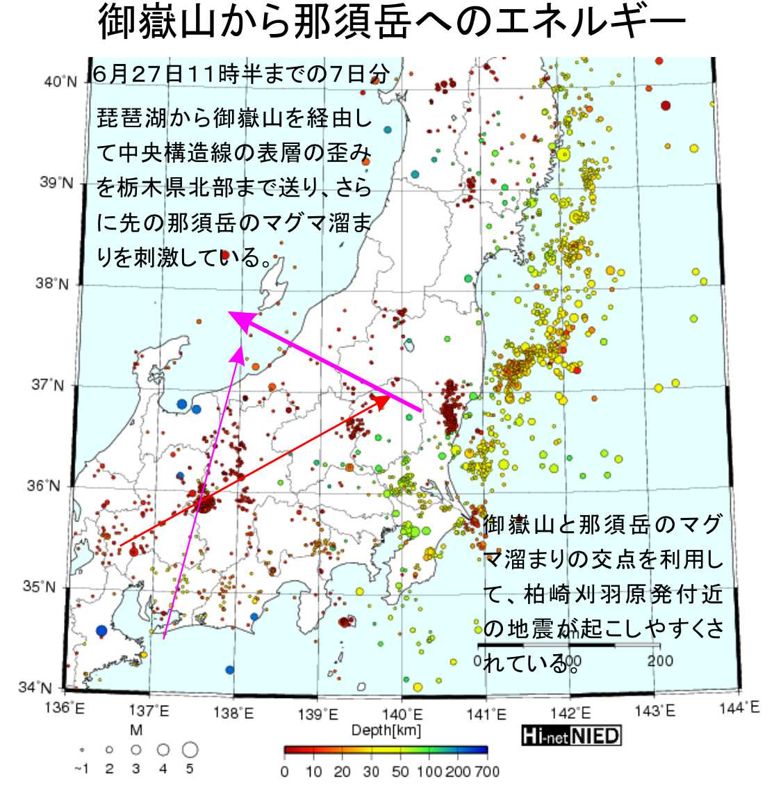 地震の科学として、栃木県北部の地震は中央構造線の流れで起きる地震です。この地震で表層域の歪みが今の時点で那須岳に届いており、あとはどの様に動かすかでしょう。富士山の動きも組み合わせるなど、マグマ溜まりの交点を支点にしてエネルギーをやり取りして柏崎刈羽原発付近の地震に出来ると思われます。イラストを参照下さい。
