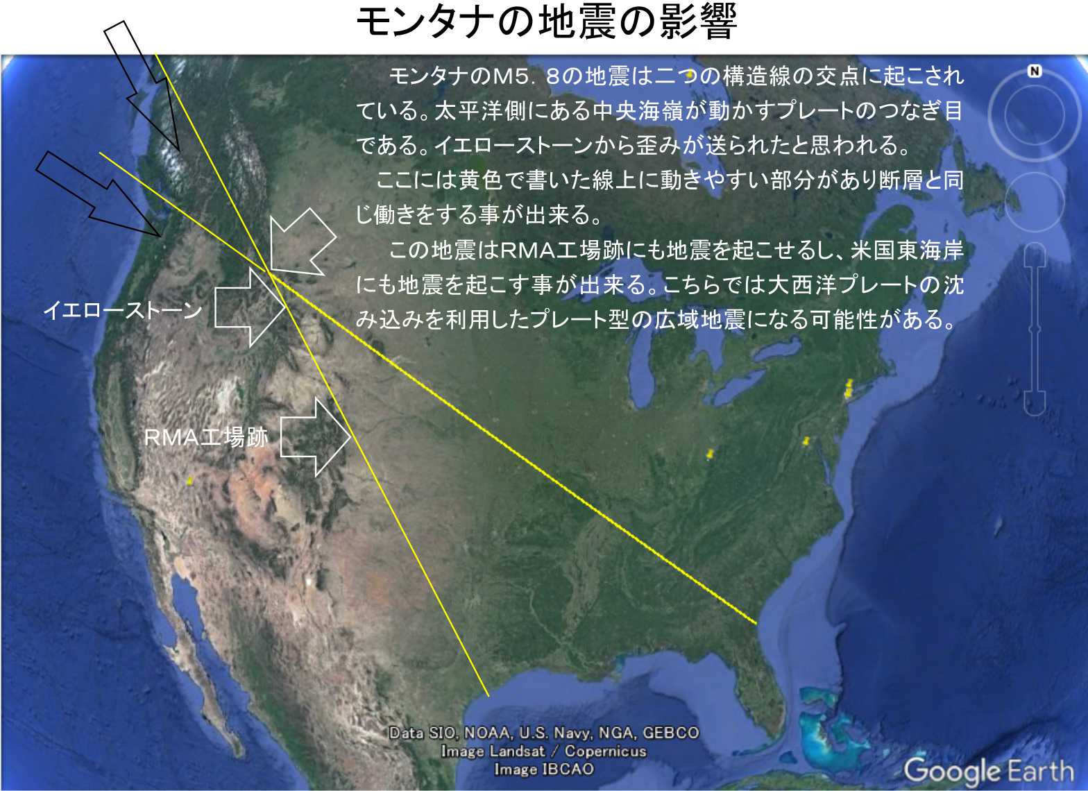 この地震はイエローストーンの群発地震が誘発した物と思われ、同じ構造線の上にある震源地になると思います。約300km程離れていますが、この震源地にはもう一つの構造線が重ねられており、2つの構造線上での地震を誘発出来る状況です。