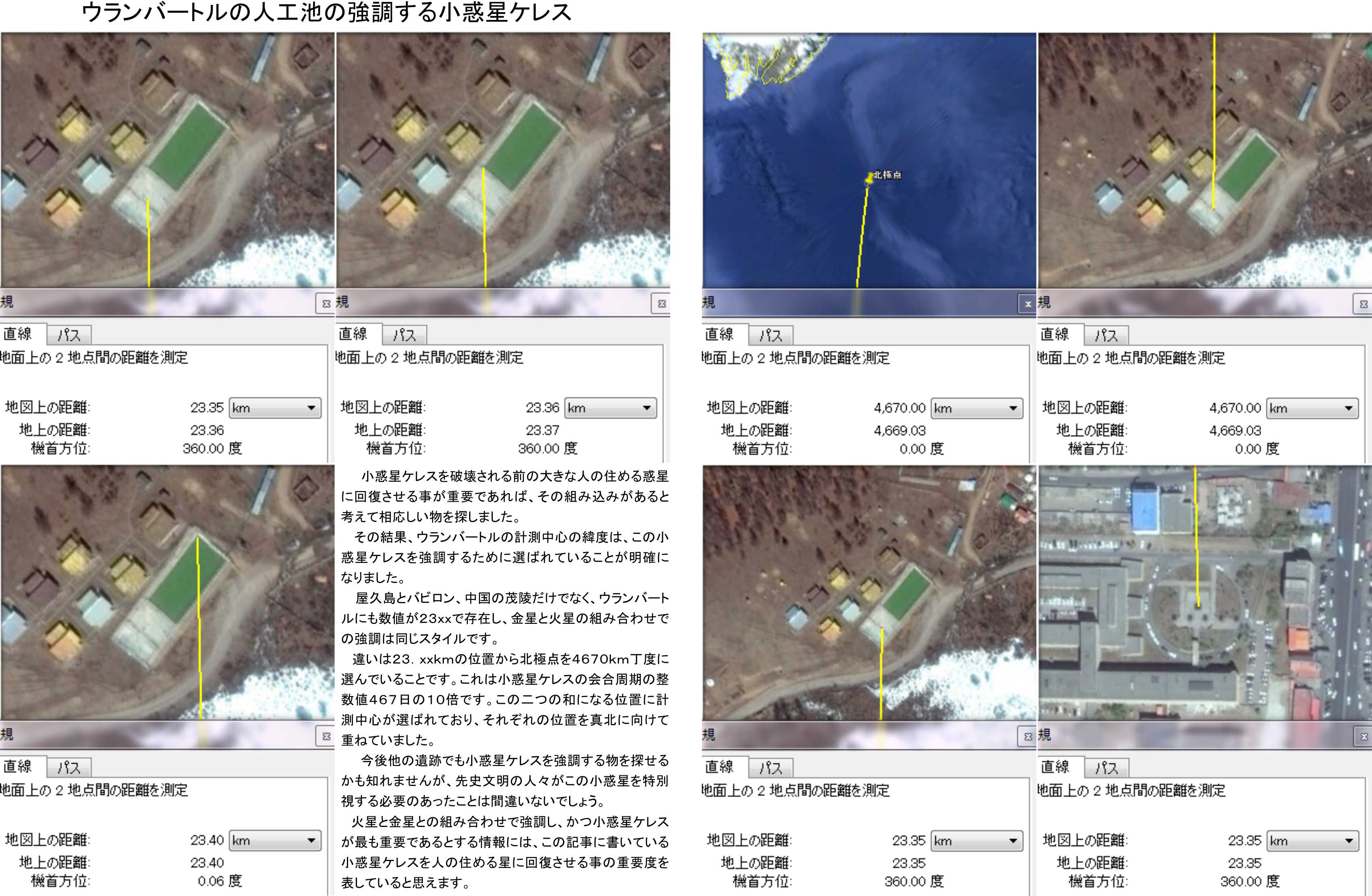 違いは23.xxkmの位置から北極点を4670km丁度に選んでいることです。これは小惑星ケレスの会合周期の整数値467日の10倍です。この二つの和になる位置に計測中心が選ばれており、それぞれの位置を真北に向けて重ねていました。