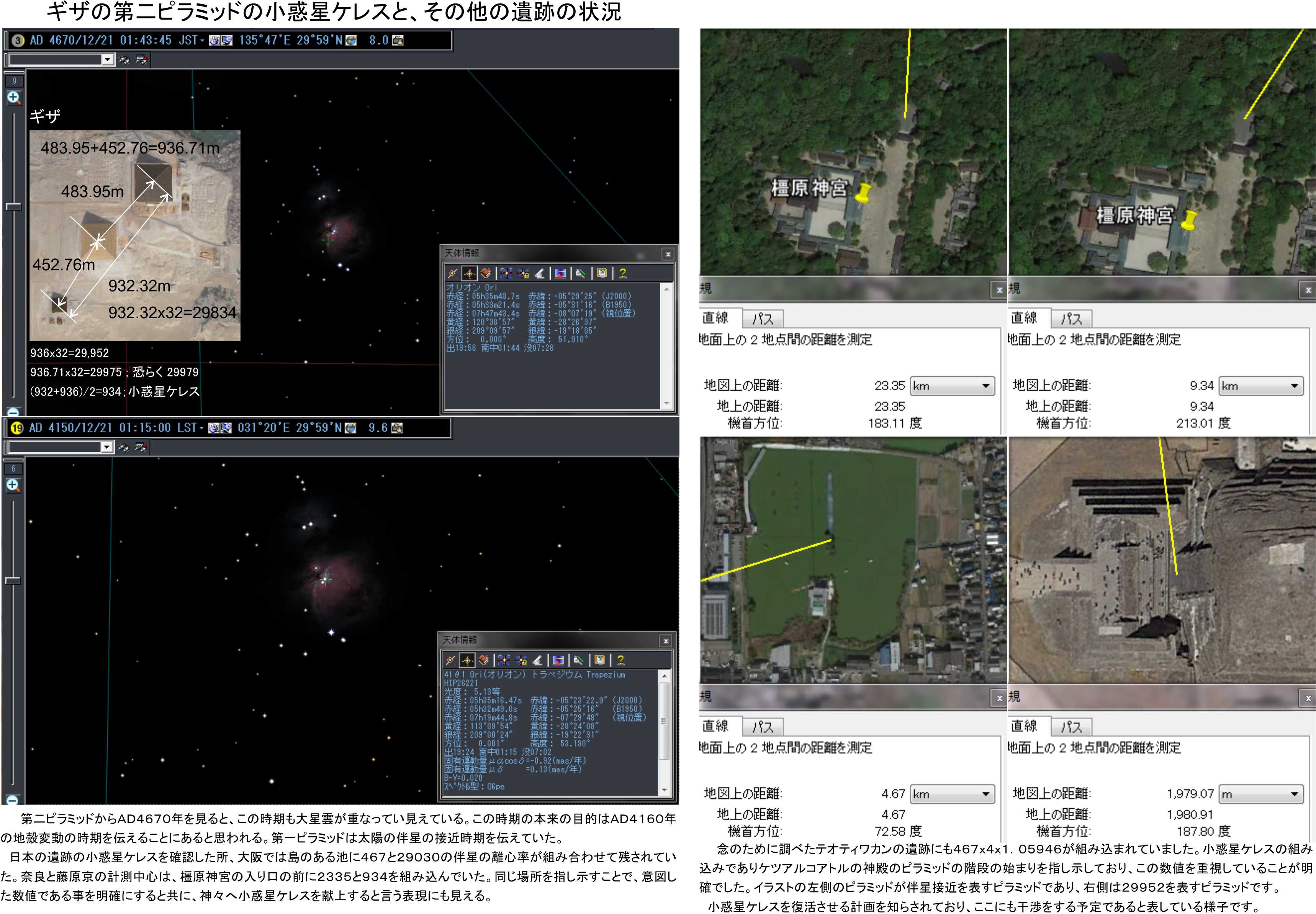 エジプトのピラミッドは太陽の伴星の接近と、関連する地殻変動について伝えていると考えて来ましたが、ここにもう一つ小惑星ケレスへの強調を加えることが必要になりました。第一ピラミッドは地球を縮尺した物とみられていますが、底辺には小惑星ケレスの公転周期が1/2で組み込まれています。AD467年にはオリオン座の剣に相当する星を重ねており、その強調は繰り返されています。
