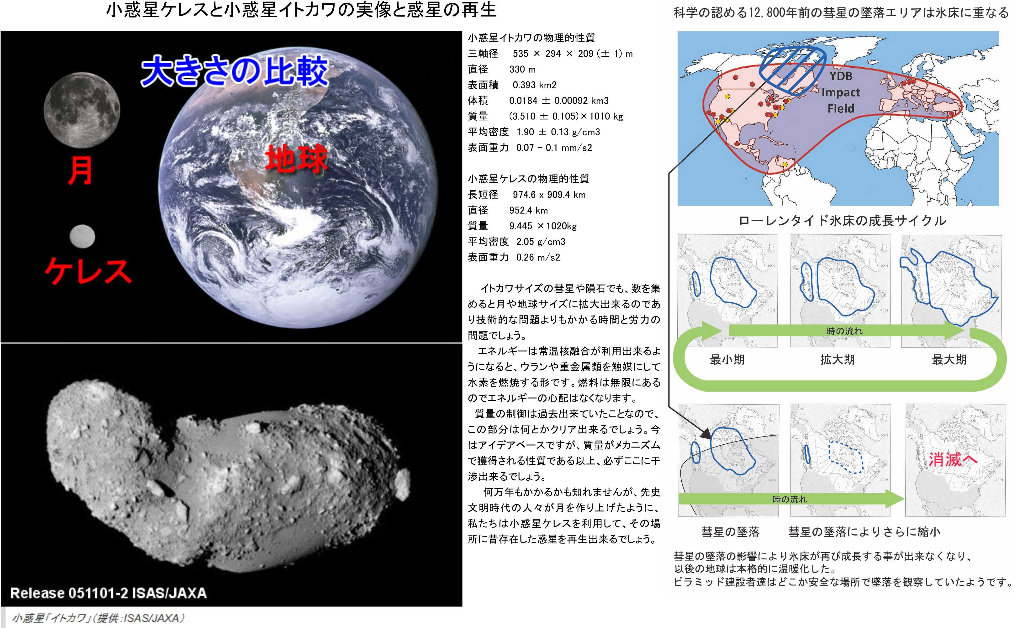 小惑星ケレスを地球サイズに回復するとして、約12660年前の彗星の墜落が参考になります。この彗星は先史文明の人々が人工的に墜落させた物であり、その後の地球温暖化に役立ったことは明確です。当時のローレンタイド氷河を破壊し、その後の温暖化を加速したのでした。