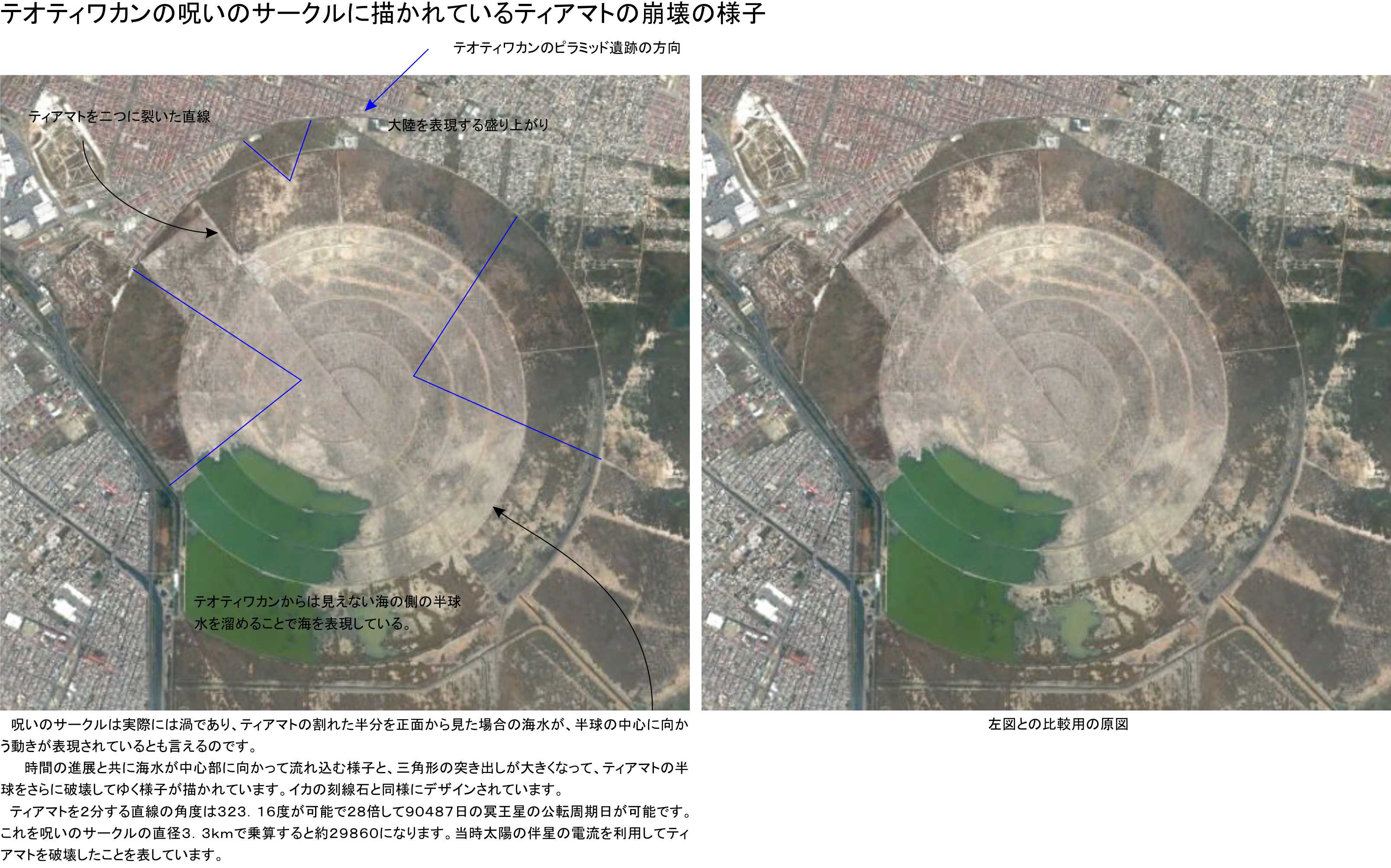 球が二つに割れる表現を改めて探してみましたが、この記事を書いてイラストをまとめた後で気づきがありました。記事を書く前に遺跡を一通り調べ直した時には気づけなかったので少々情けないのですが、テオティワカンの呪いのサークルを2分割する直線は、このティアマトの崩壊を表していることに気づけました。