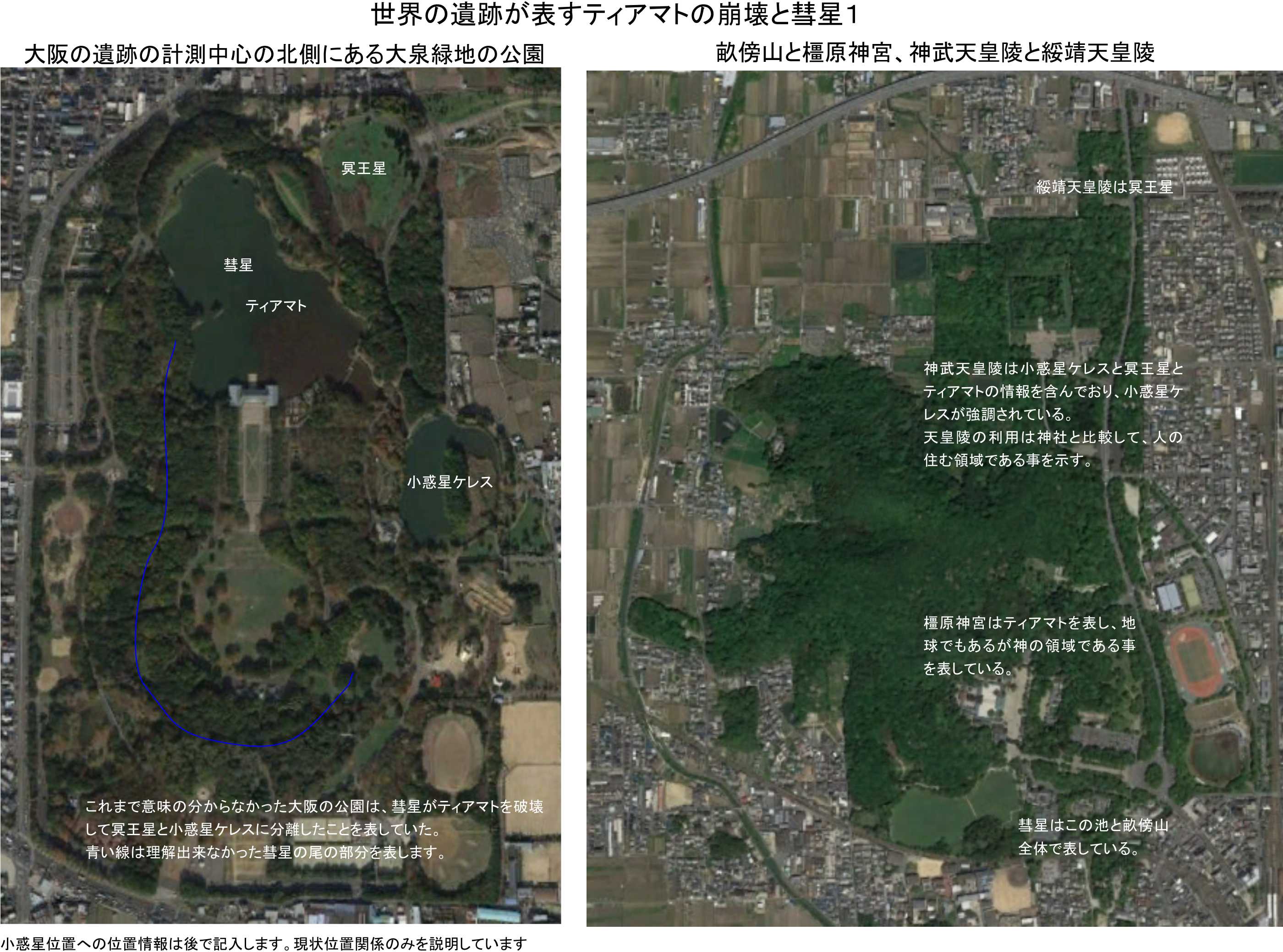 彗星は橿原神宮の南隣の池が中心で、そこから延びる尾は畝傍山全体であり、その中に神武天皇陵と綏靖天皇陵も含まれています。
