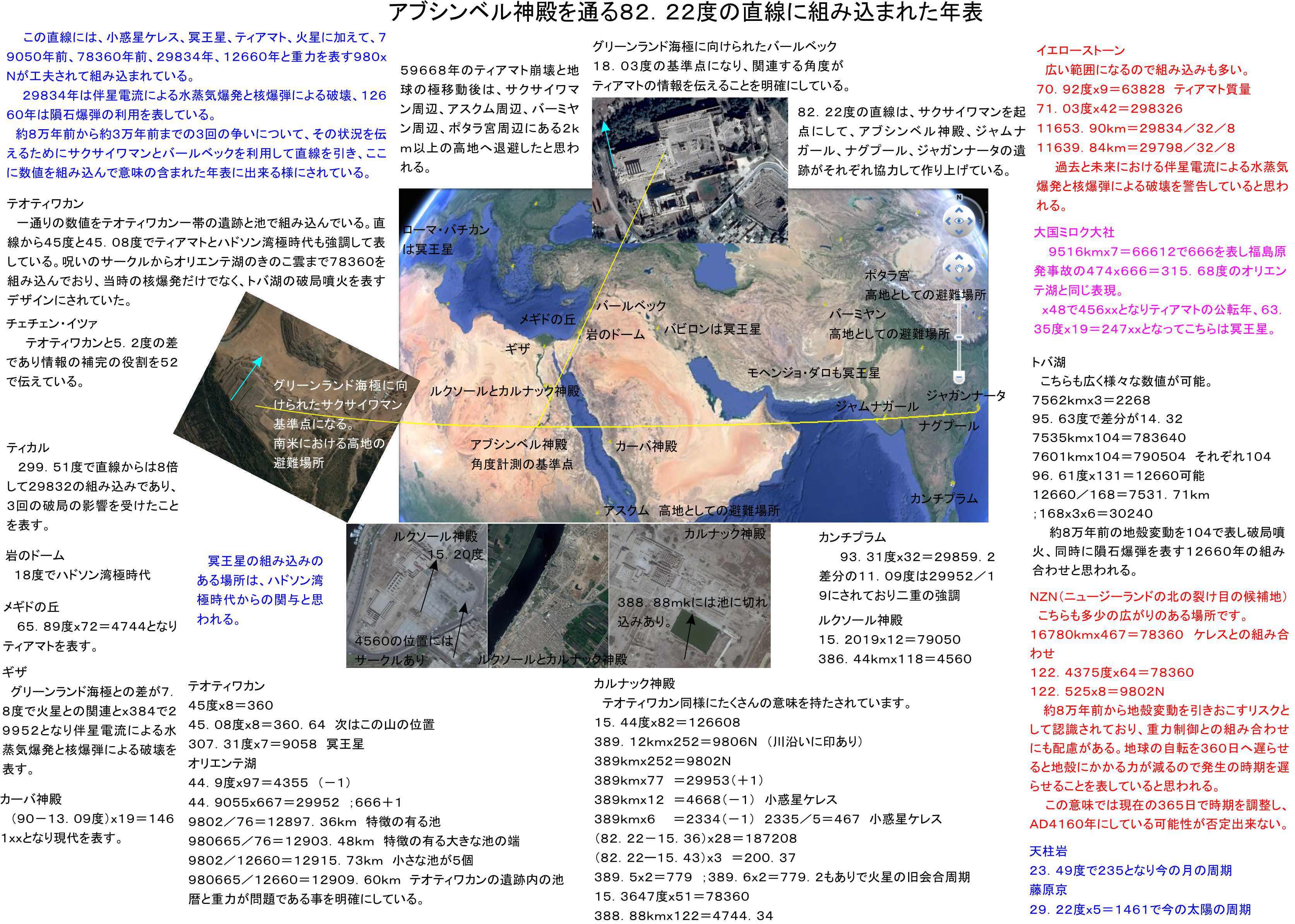 アブシンベル神殿を通る82.22度の直線と、この直線との間に角度を調整されて情報を伝える遺跡は、新しく大きな主要な遺跡群でした。
