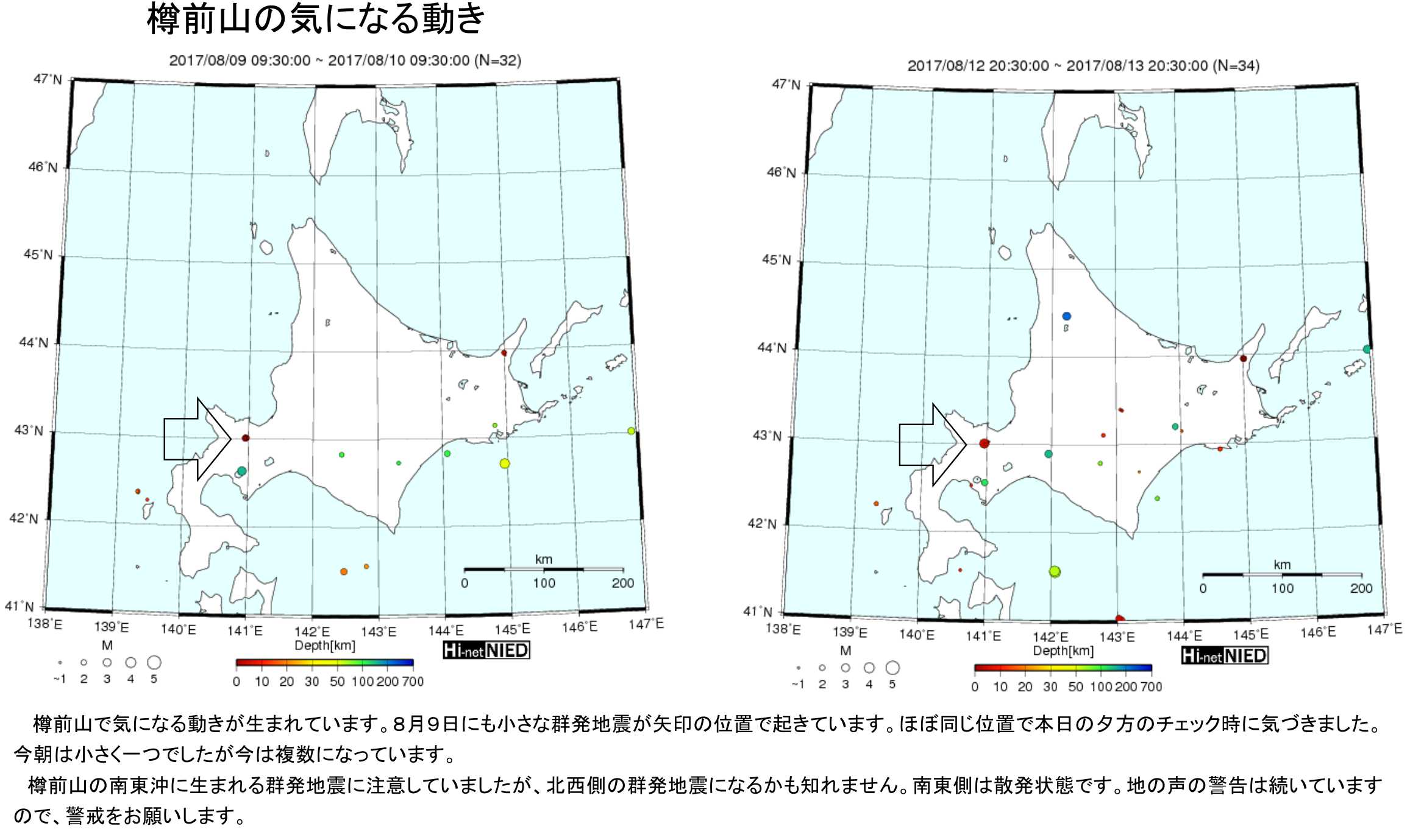 本日は樽前山の北西の方向で群発地震が起きています。9日にも起きているので、今後の活動に注意が必要な状況です。イラスト参照下さい。