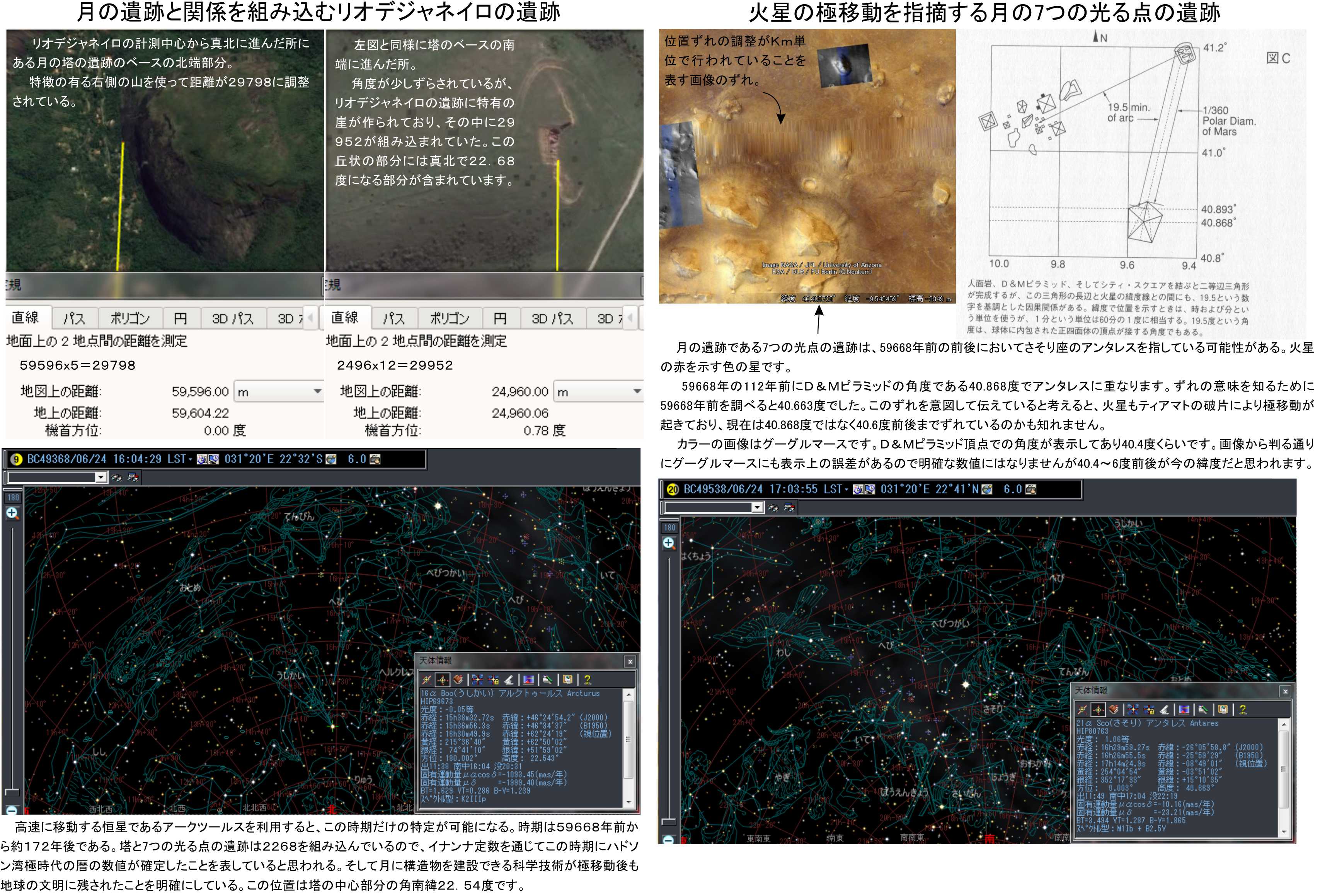 この月の遺跡群はリオデジャネイロの遺跡にその数値が組み込まれて残されていました。南緯22.68度を含める遺跡の候補がリオデジャネイロになり、遺跡の計測中心より22.68度への数値の組み込みが確認できています。リオデジャネイロでは、9kmの塔のベースの中心と南北両端の緯度が利用されていました。