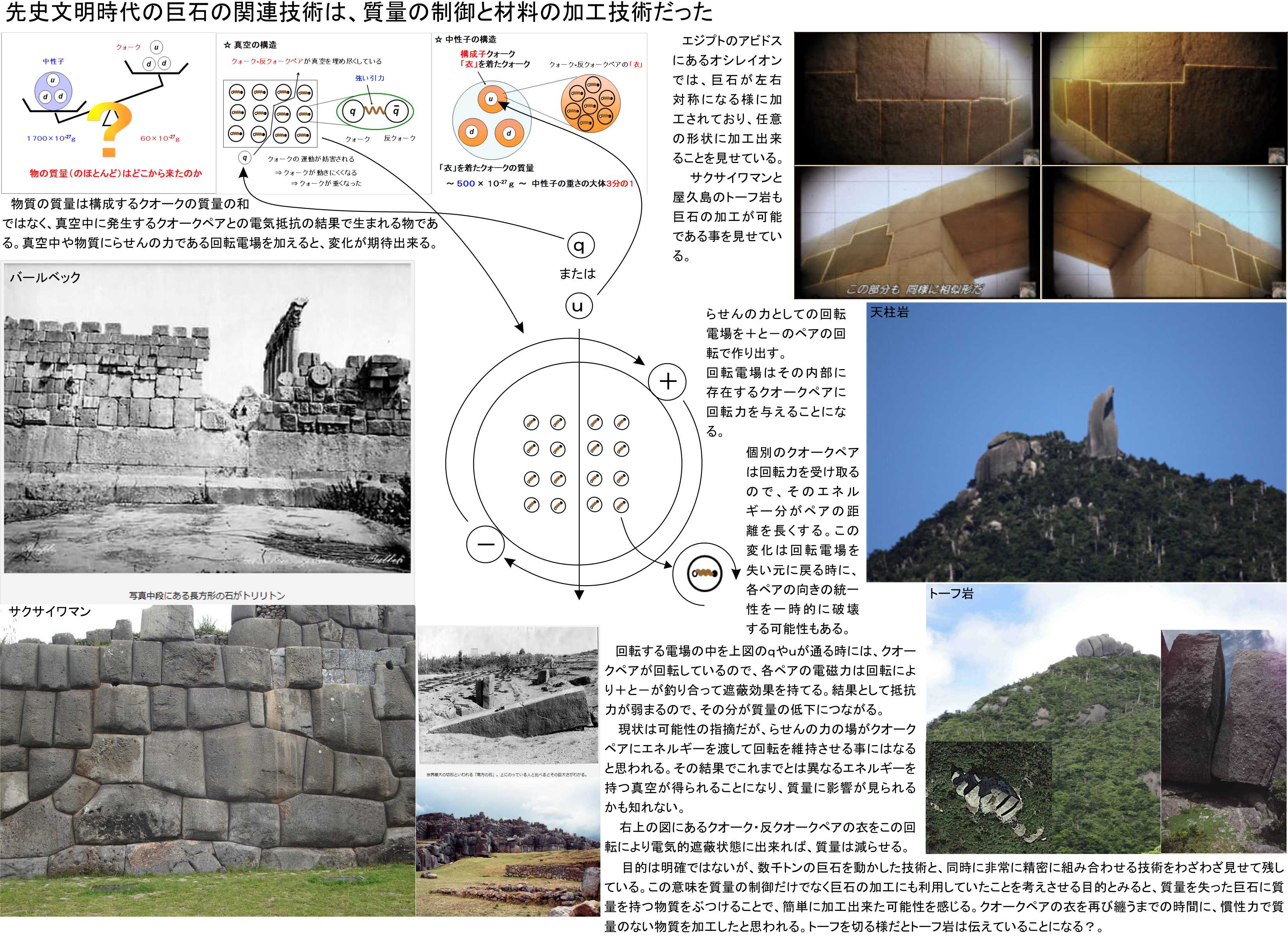 その続きが質量の制御技術です。これも記事に書いてきている所です。理論は素粒子論になるので分かりにくいかも知れませんが、質量が物質にある特有で先天的な物ではなく、メカニズムを通して後天的に獲得できる物である事は既に明確です。これに干渉できれば質量の制御技術に道が開けるでしょう。
