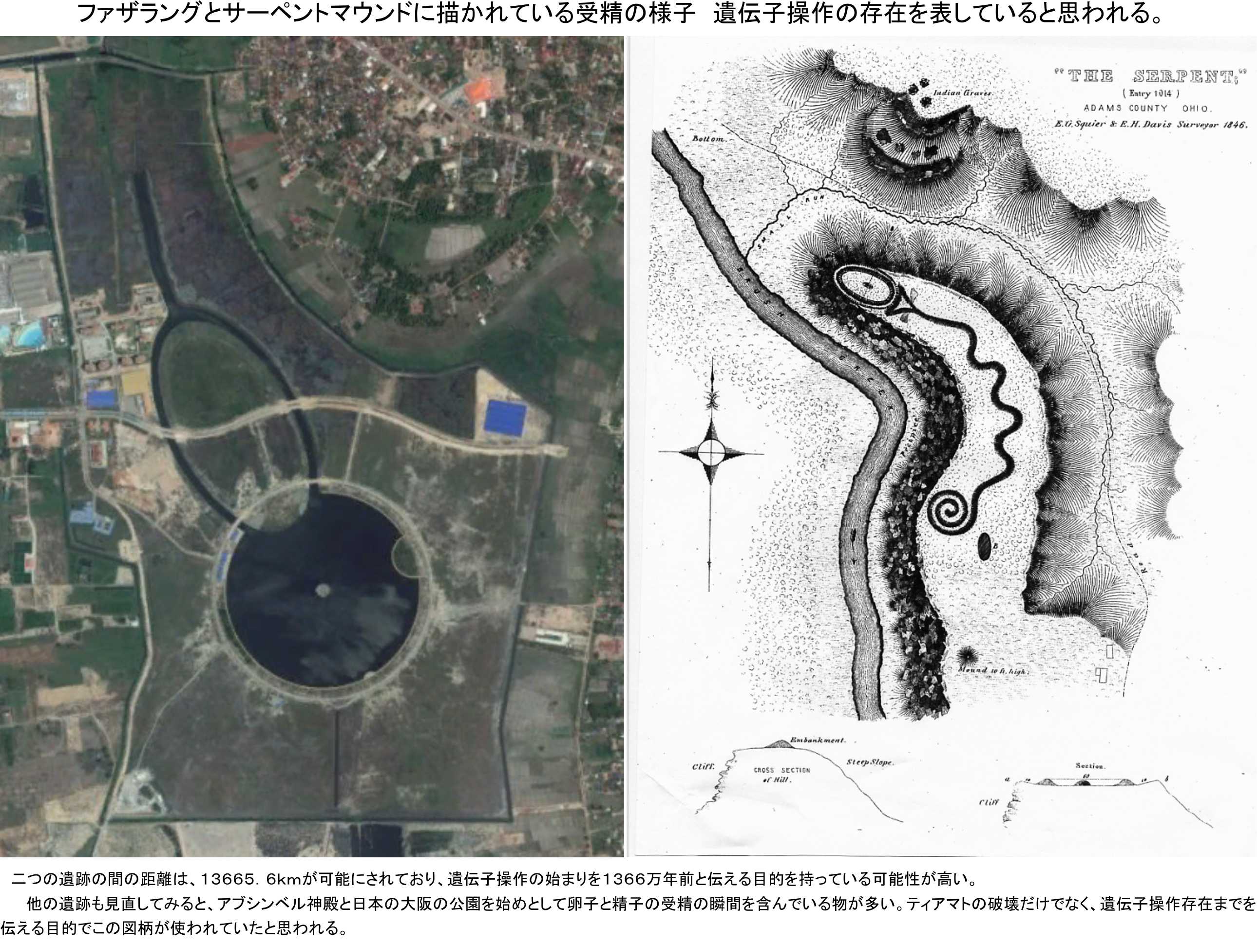記事の準備は進んでおり、遺伝子操作は1366万年前からの可能性を遺跡に組み込んでいました。既にお送りしている彗星のイラストに受精の瞬間を描いたラオスの遺跡があるのですが、ここからもう一つの受精の手前と思われるアメリカのサーペントマウンドまで13665.6kmが組み込まれていました。