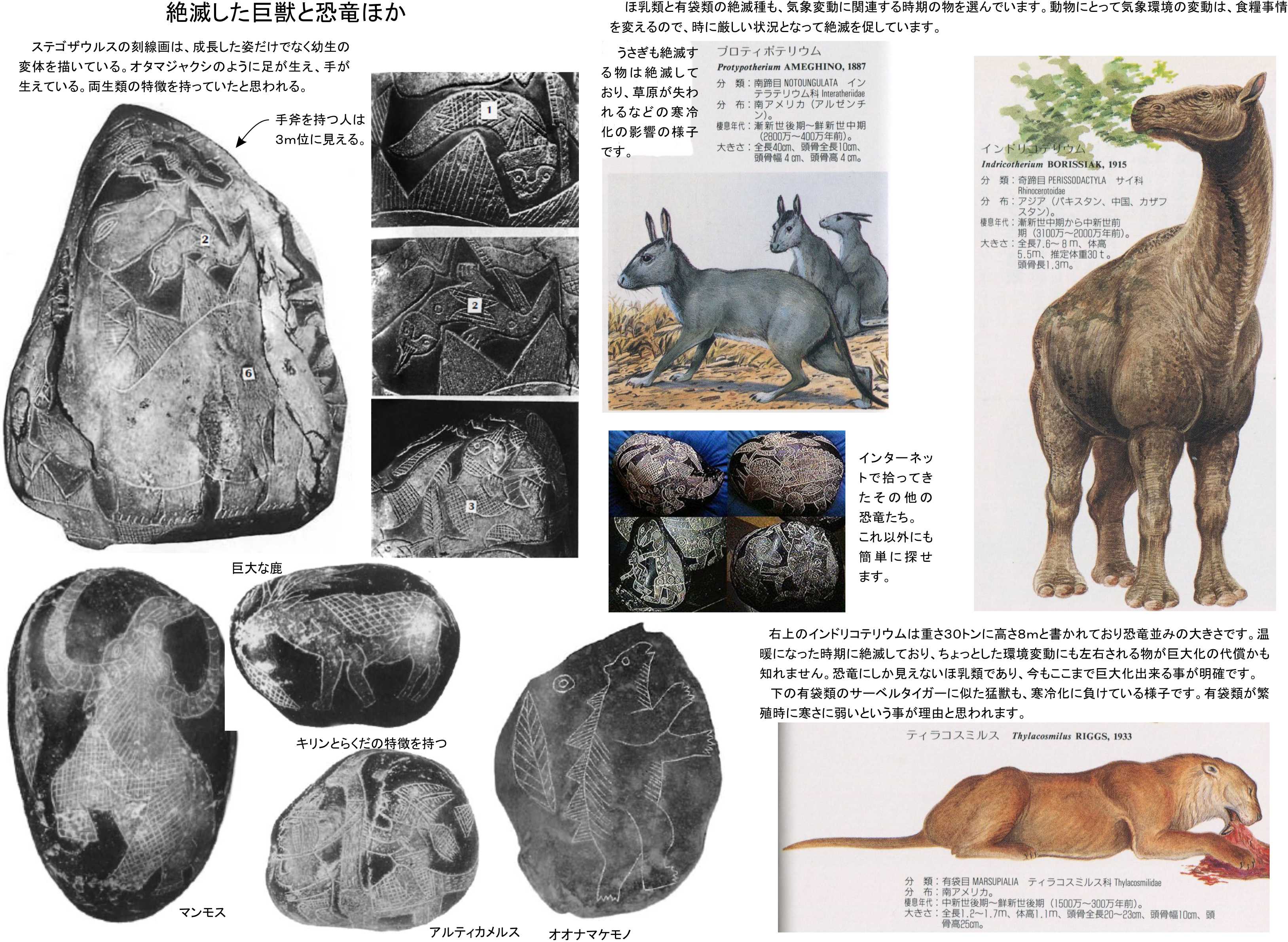 この証拠になる物がイカの刻線石に描かれた恐竜たちです。多くの種類とマンモスなど最近まで生きていた種族も描かれています。人類が1000万年前に活動をしているのであれば、イカの刻線石の残された土地であるペルーでは、カナダやフランスよりも温暖でしたし、さらに温暖なアマゾン地区とも陸続きです。こちらでの生き残りが出来ており、南アメリカ大陸での広がりを持っていたのではないかと思います。アフリカの中央部も同様です。