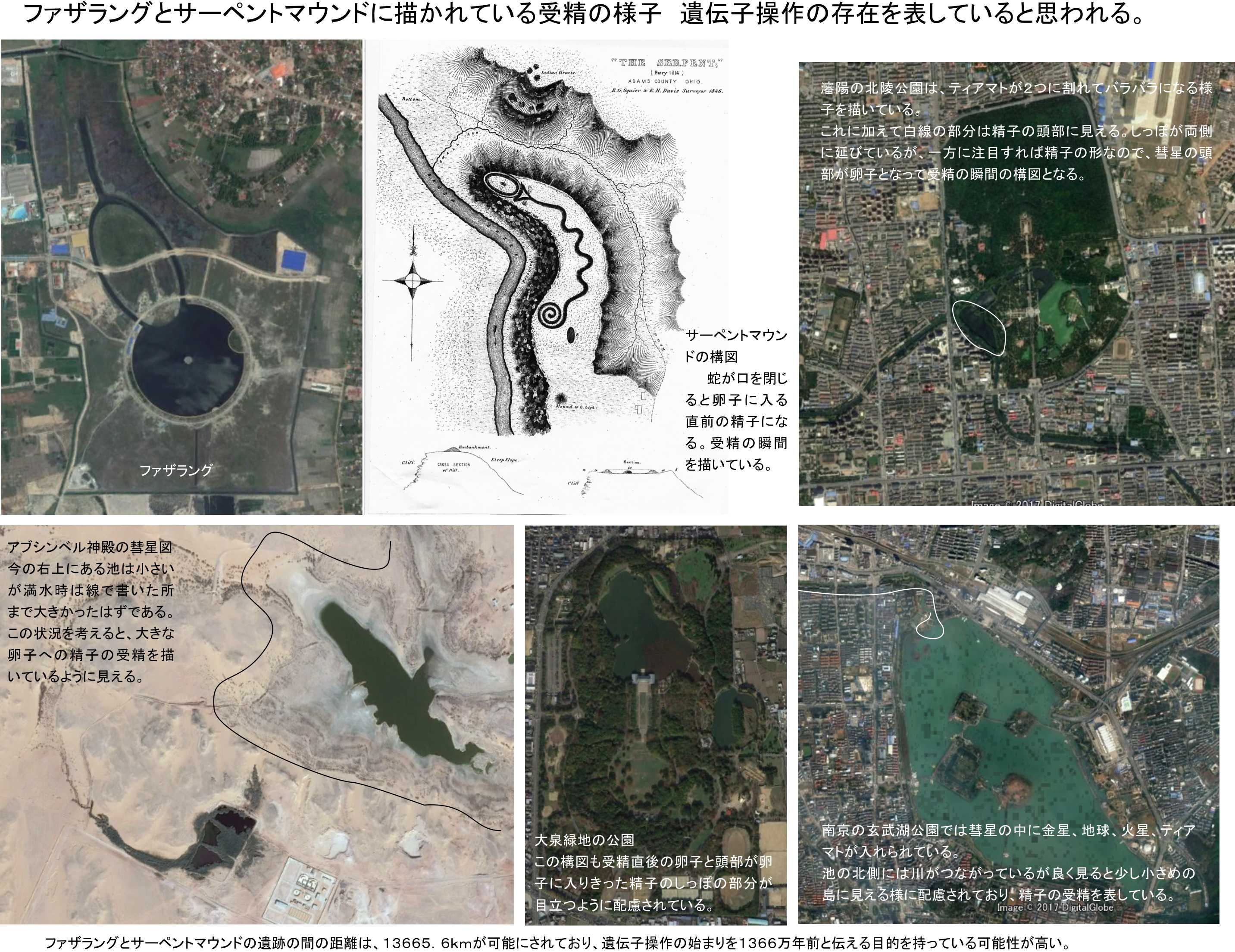 同様に遺跡を検討してみると、似たような構図が他にも存在していることが明確です。アメリカのサーペントマウンドの構図は蛇の口を閉じれば受精の直前の構図です。