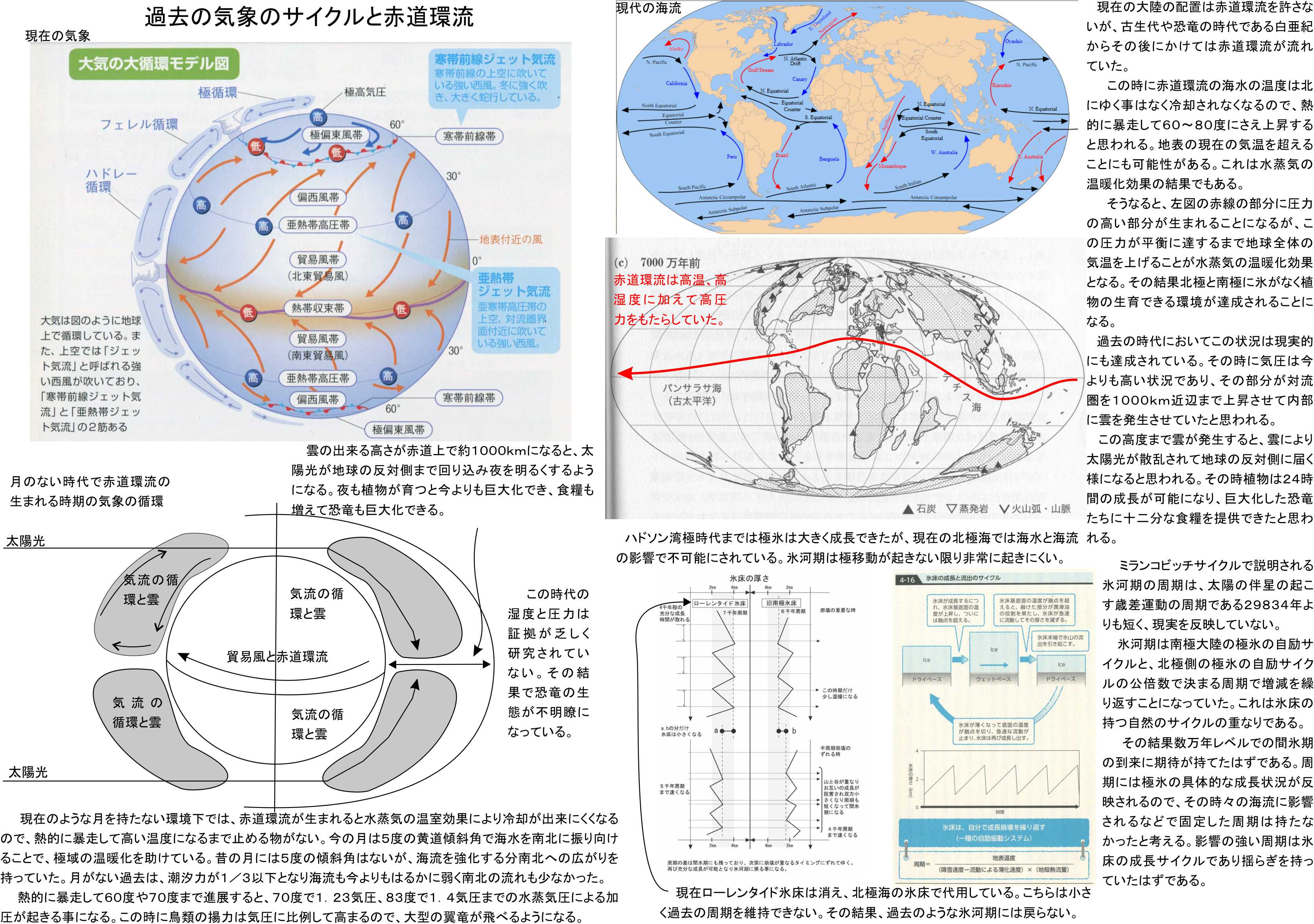 この中で重要な物が赤道環流の存在です。この赤道環流の存在は地理的には明らかですがその効果がどの様な物であったかは検討されてきていないのです。恐竜時代にはよく分からない事が多く、彼らの巨体をどの様に支えていたのかと、翼竜が飛べる理由に揚力が足らないことなどです。