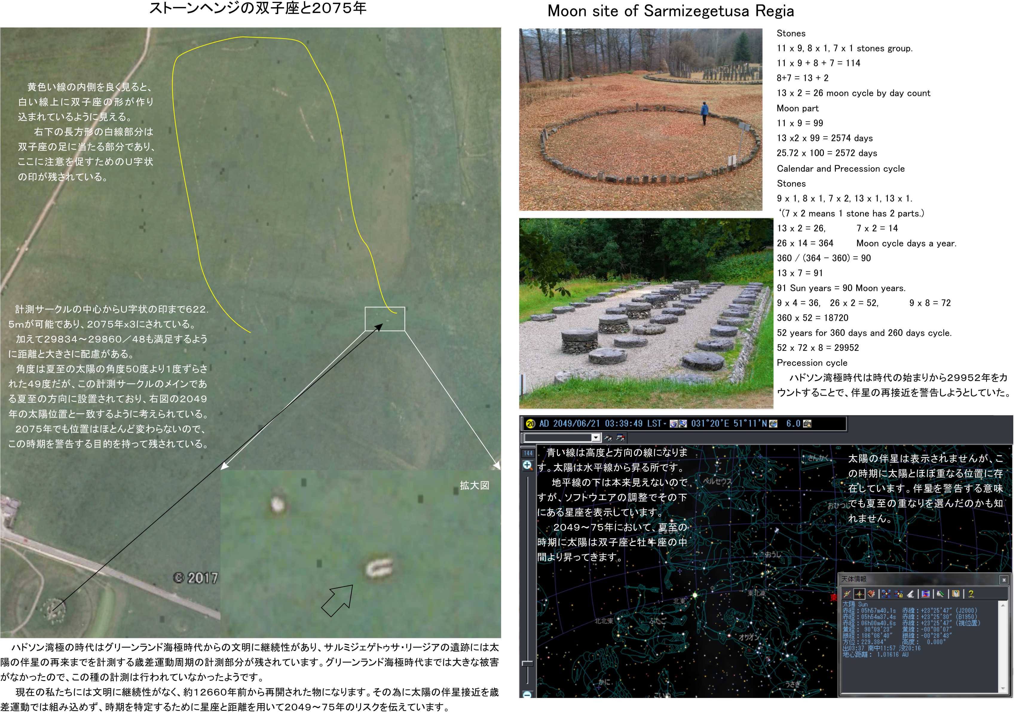 もしサルミジェゲトゥサ・リージアの遺跡でこの数値が使われたのでしたら、同様に現代を代表するストーンヘンジにも相応の工夫があるはずです。これを検討して探してみました。その結果がイラストに紹介する双子座のイラストと太陽の位置を表すエリアの存在です。