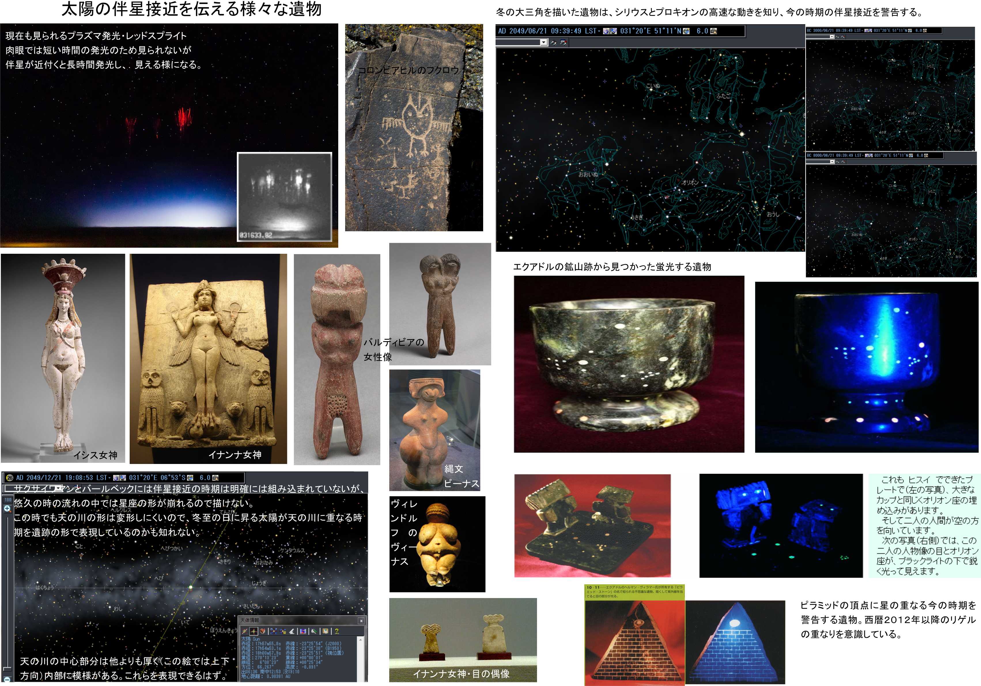 プラズマイベントについてはたくさんの遺物が残されており、イナンナやイシスなど女神が利用されています。夜空に輝くレッドスプライトがこの様に見えるので、この種の像を残してきているのかも知れません。イナンナ女神は7万年以上前から宗教化されているので、さらに古い時代にも同様に利用されていた可能性のある女神です。