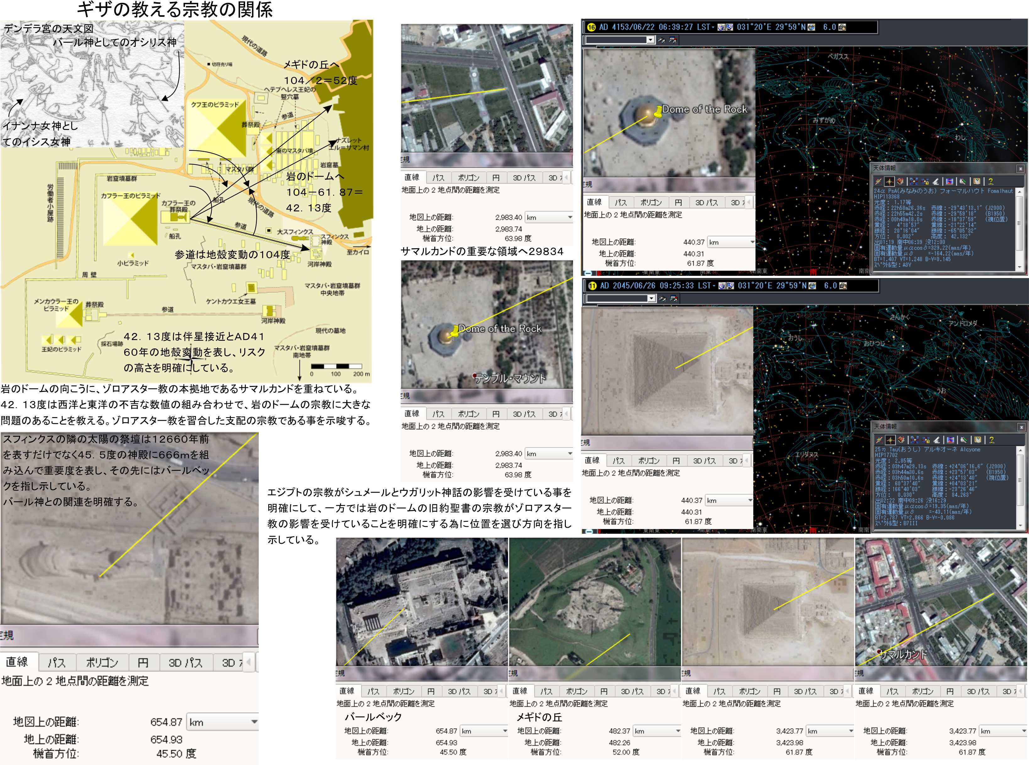 彼らはエジプトの宗教がシュメールとウガリット神話の影響を受けている事を明確にして、一方では岩のドームの旧約聖書の宗教がゾロアスター教の影響を受けていることを明確にする為に位置を選び方向を指し示しているのです。シュメールの影響はデンデラの天文図にイナンナ女神がイシス女神として描かれている部分から明確であり、バビロンの遺跡がギザの役割を補完してきた部分からも明確でしょう。