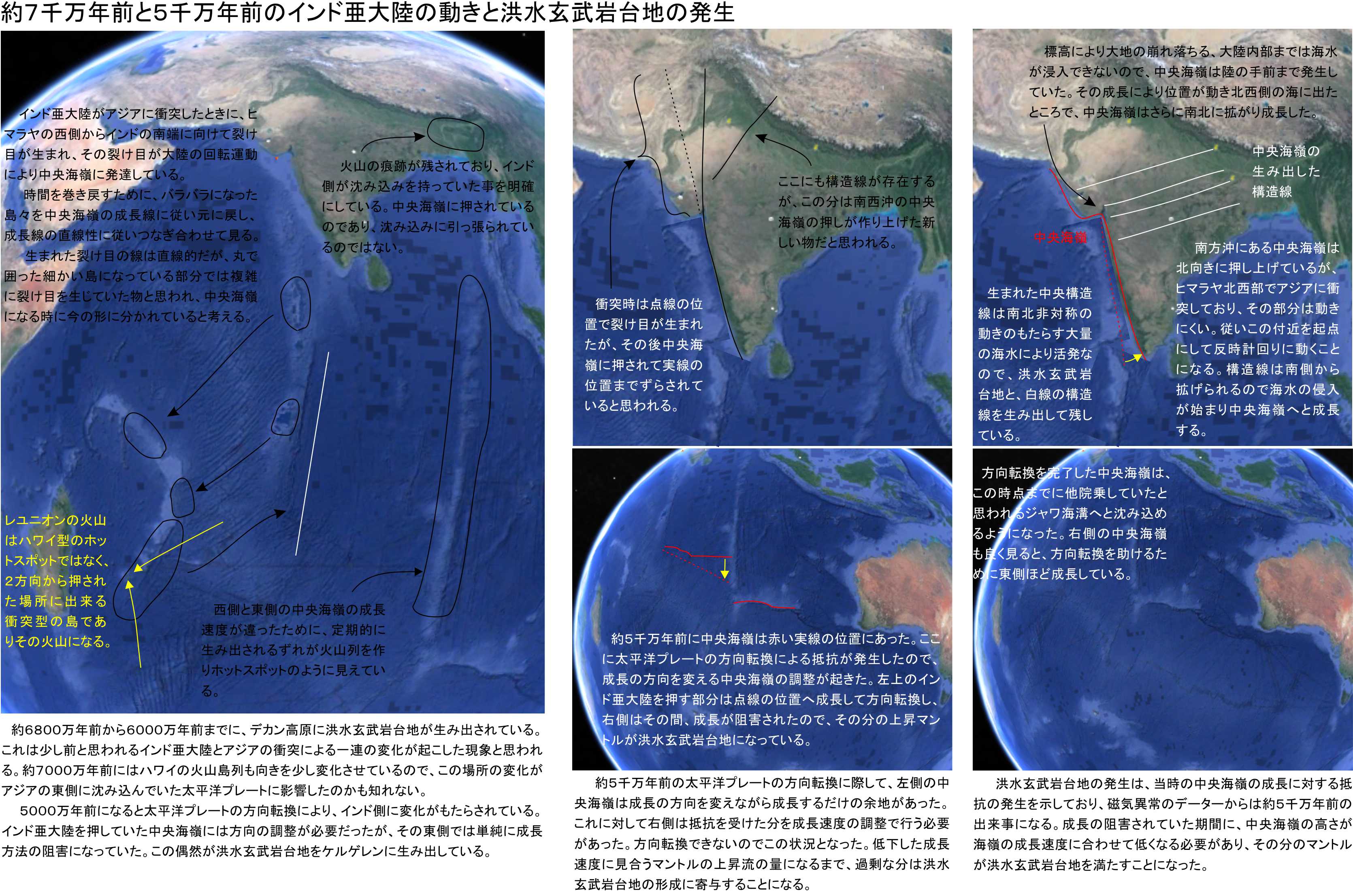この後は生み出された中央海嶺の拡大と、南方沖に元からある中央海嶺により北上する力が加わって、デカン高原からレユニオン島につながるホットスポット状の島列に、インド亜大陸の破片は拡がったのでした。地球のコアに成因のあるホットスポットはここには存在していないでしょう。教科書にはホットスポットの始まりには大きなエネルギーを持つマグマ流体の塊が描かれるのですが、ロシアに始まりの残るハワイでも、カリフォルニアに上陸したイエローストーンでも、始まったばかりのホットスポットであるピナケイトでも、この種の洪水玄武岩台地の形成は起きていません。