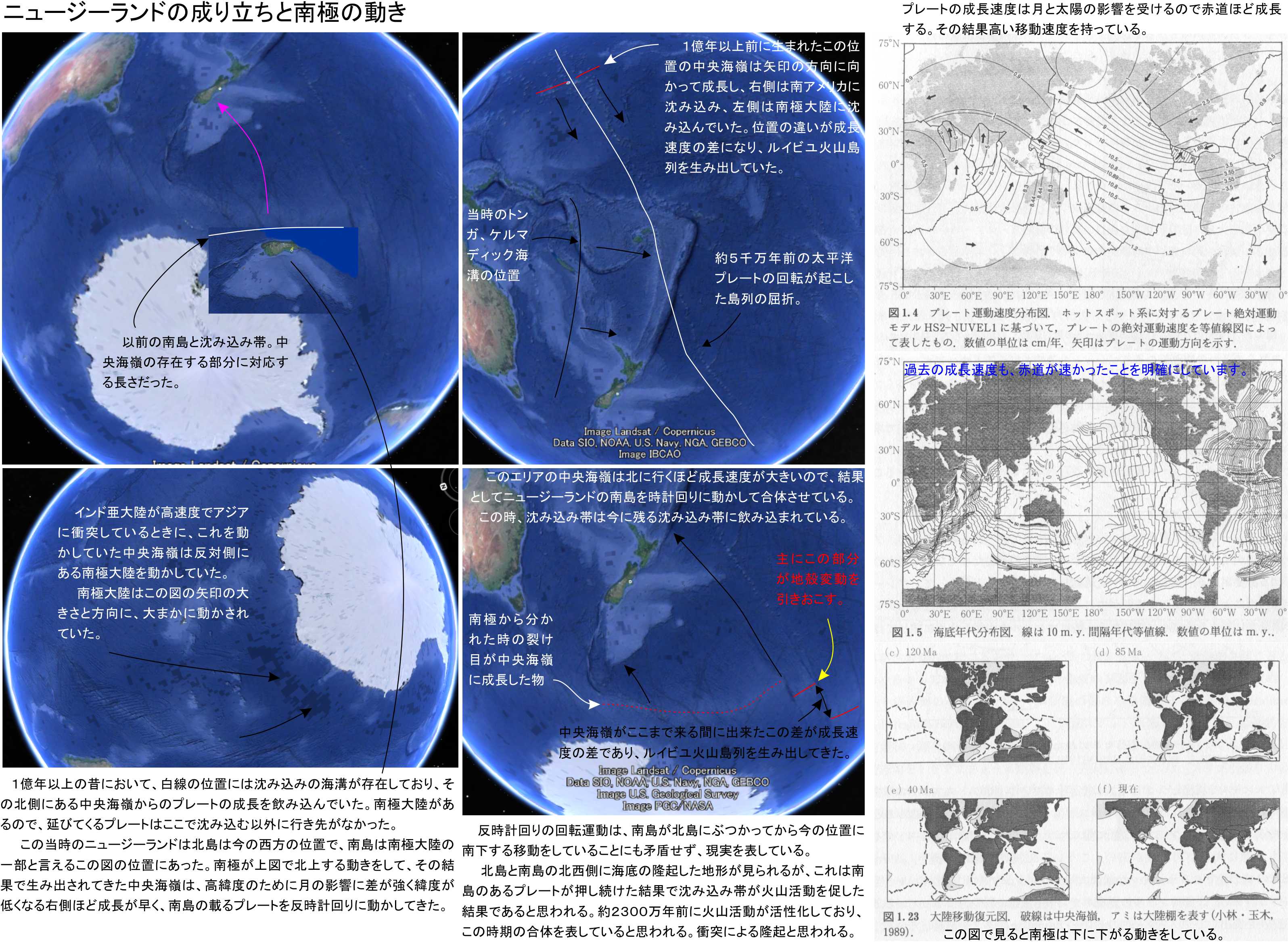 続きは教科書ではほとんど触れられることのない、南極大陸の分裂とニュージーランドの合体の動きです。これらはインド亜大陸が中央海嶺により北に押されていたときに、その反対側に反作用として送り出したプレートとその力の作用です。ルイビユの火山列がこの状況を教える鍵でした。