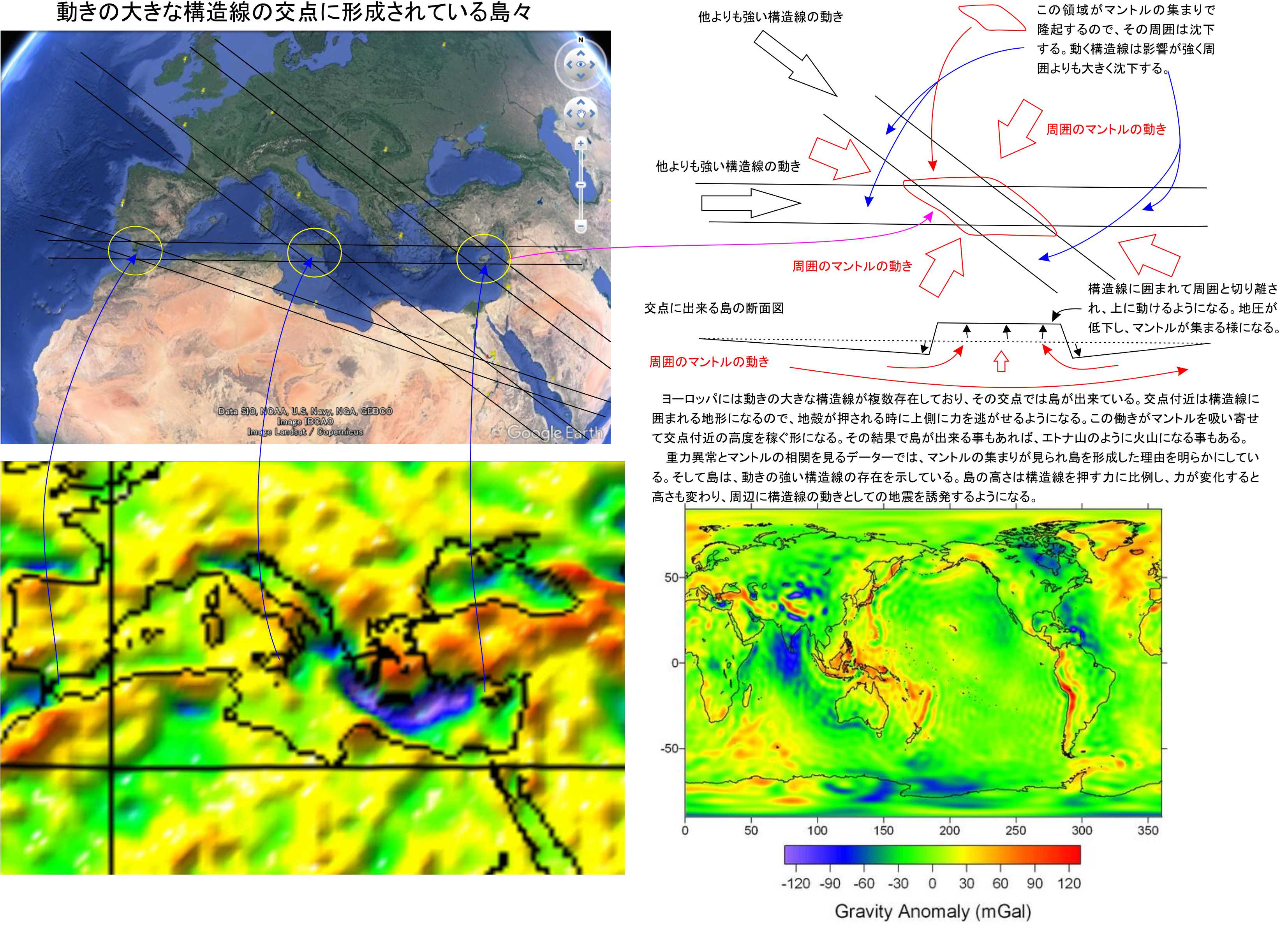 数十kmから100km前後の間隔の構造線はその挟まれている部分を動かしていることが多いようです。動いている部分が交差すると、その部分に島が生み出されていました。
