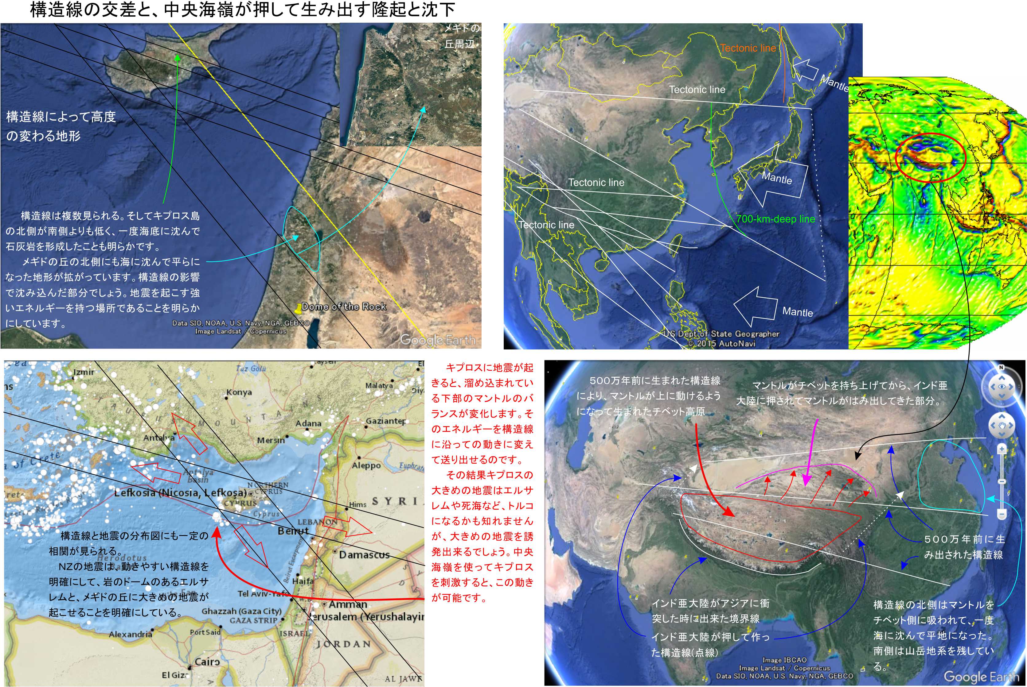 グーグルアースは島から離れた場所の隆起と沈下にも構造線の動きに準じた変化を見せていました。メギドの丘の部分は拡大していますので参照下さい。メギドの南西側は山岳地系ででこぼこですが構造線を挟んだ北東側は平地です。一度海に沈んで平坦になった物でしょう。キプロス島同様に構造線による変化が見られています。