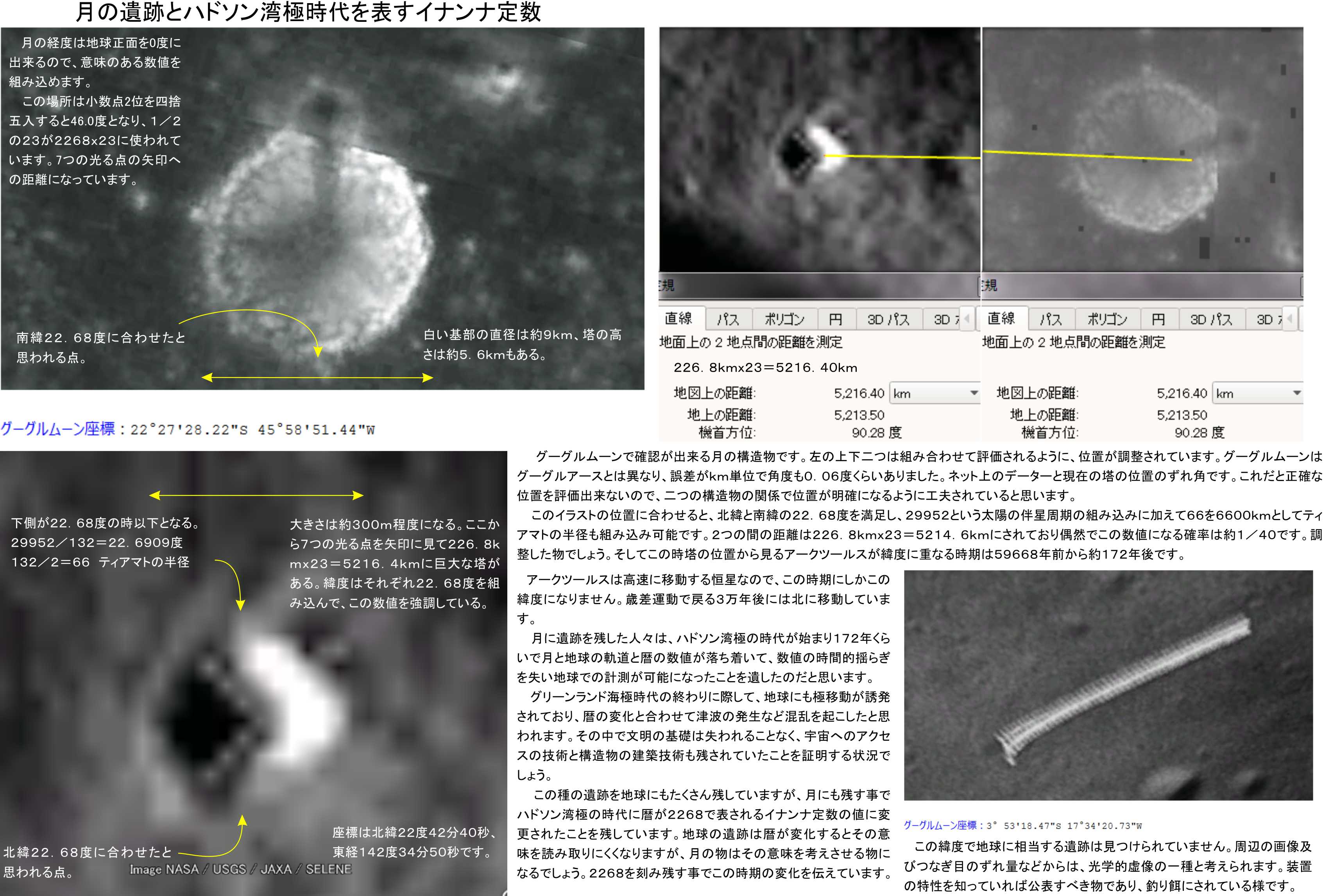 この二つの遺跡は、組み合わせて評価するように遺された物でした。その間の距離が5216.4mk=2268x23に調整されており、塔の位置は西経46.0度でした。イラスト上は小数点4桁も利用できるのですが、グーグルムーンの角度の精度が0.06度と低くて信頼できないので四捨五入した結果です。この半分の23が利用されており意図を強く感じる所です。