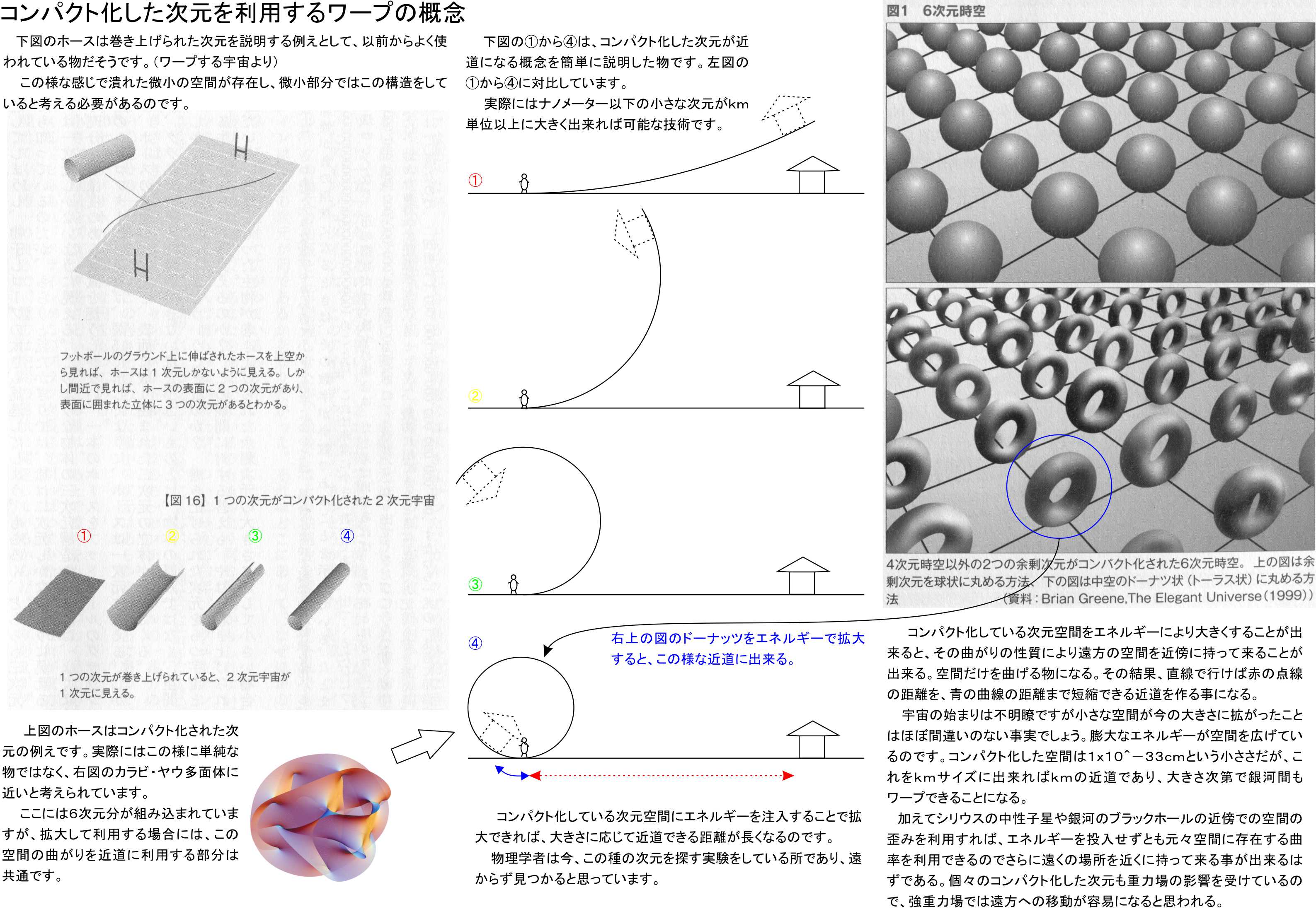 宇宙の始まりは不明瞭ですが小さな空間が今の大きさに拡がったことはほぼ間違いのない事実でしょう。膨大なエネルギーが空間を広げているのです。コンパクト化した空間は1x10^-33cmという小ささですが、これをkmサイズに出来ればkmの近道であり、大きさ次第で銀河間もワープできることになるはずなのです。