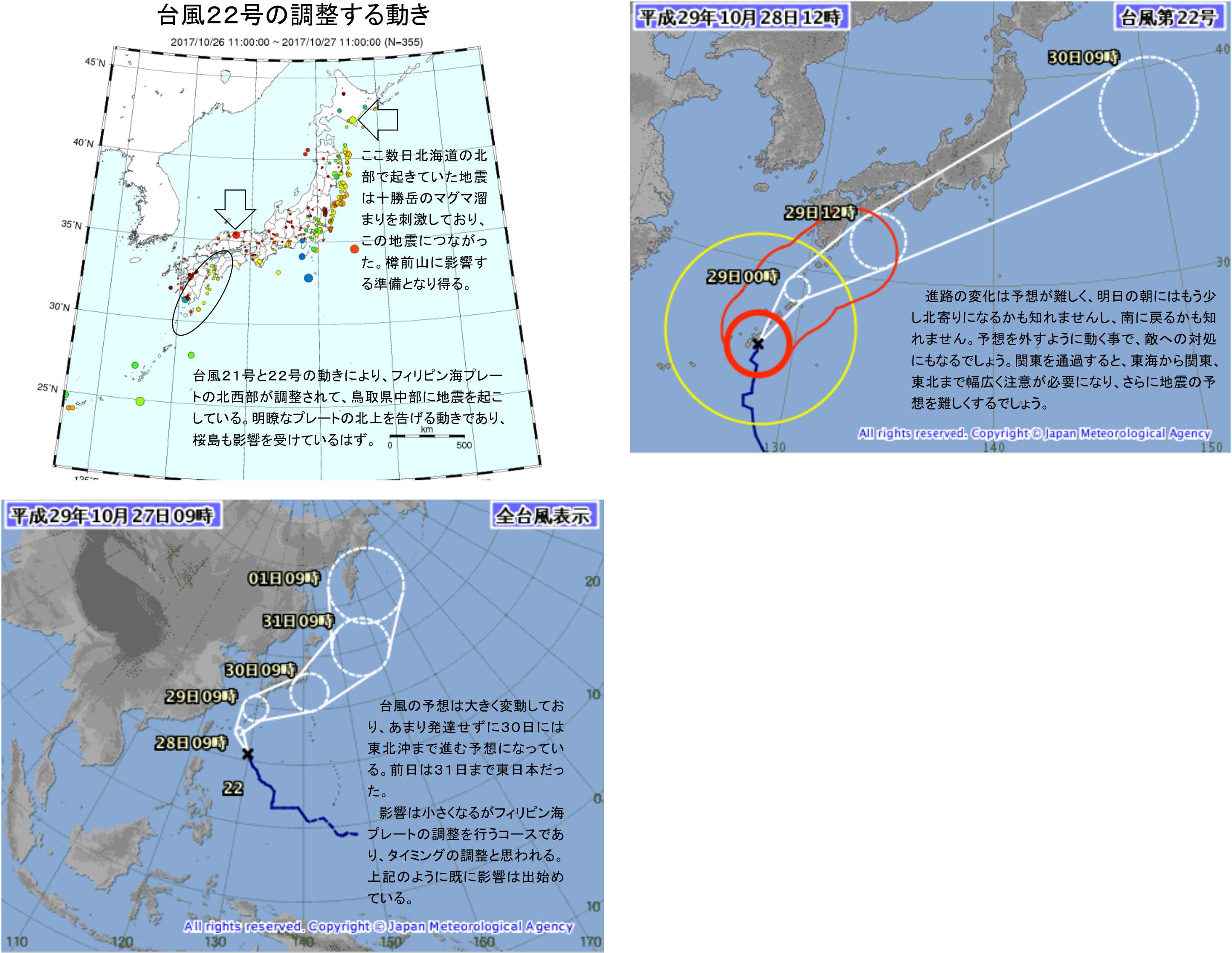 9時の台風の位置と今後の予想が大きく変化しており、解析をしています。フィリピン海プレートの調整が進展しており関連する地震も明確になっています。今後の動きに注意が重要な期間に入っていると思います。