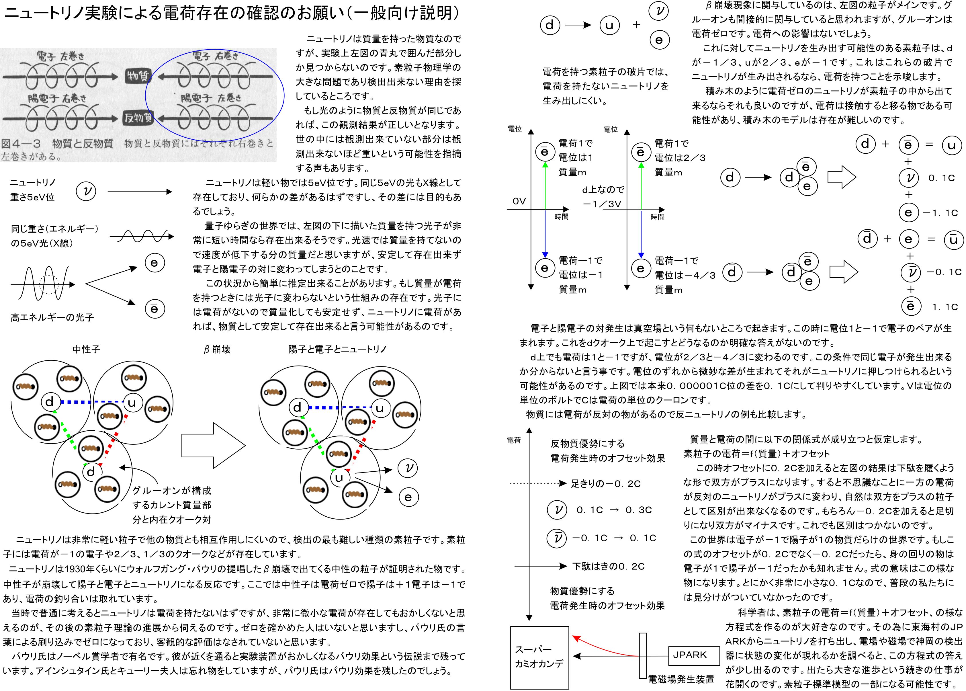 これに対してニュートリノに電荷があるかを調べる部分は科学者へのお願いになるので、相手を説得する部分が重要になります。ニュートリノ上で、β崩壊時に釣り合いの崩れた電荷が発生する可能性を説明する部分が重要で手間取っていました。一般向けに判りやすい説明イラストも準備出来たのですが、やはりこれだけだと科学者には満足出来ないと思われ、記事での説明も冗長になることが予想されます。
