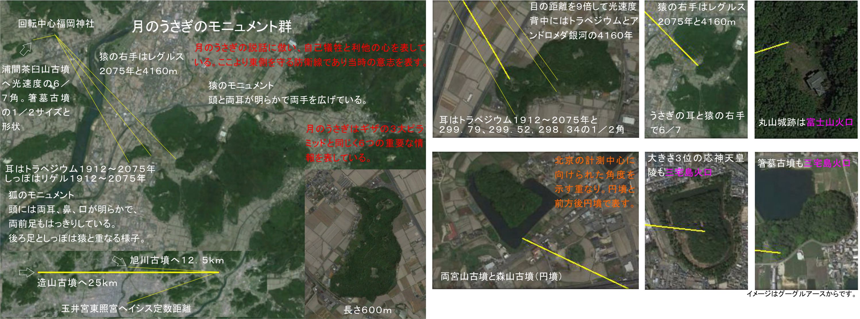 同様の目で旭川古墳(仮称)と月のうさぎを見てみて下さい。530mと600mの大きさのある物を破壊する事がどれほど難しいか。そしてどこに重要な情報が組み込まれているかを知る事が出来たかです。一部を破壊したところで、二重三重に情報は組み込まれており簡単には消せなかったのです。今読み出せている情報はイラストに載せている通りなのです。約2年前のイラスト作成時は平壌を指し示す部分を見落としていました。