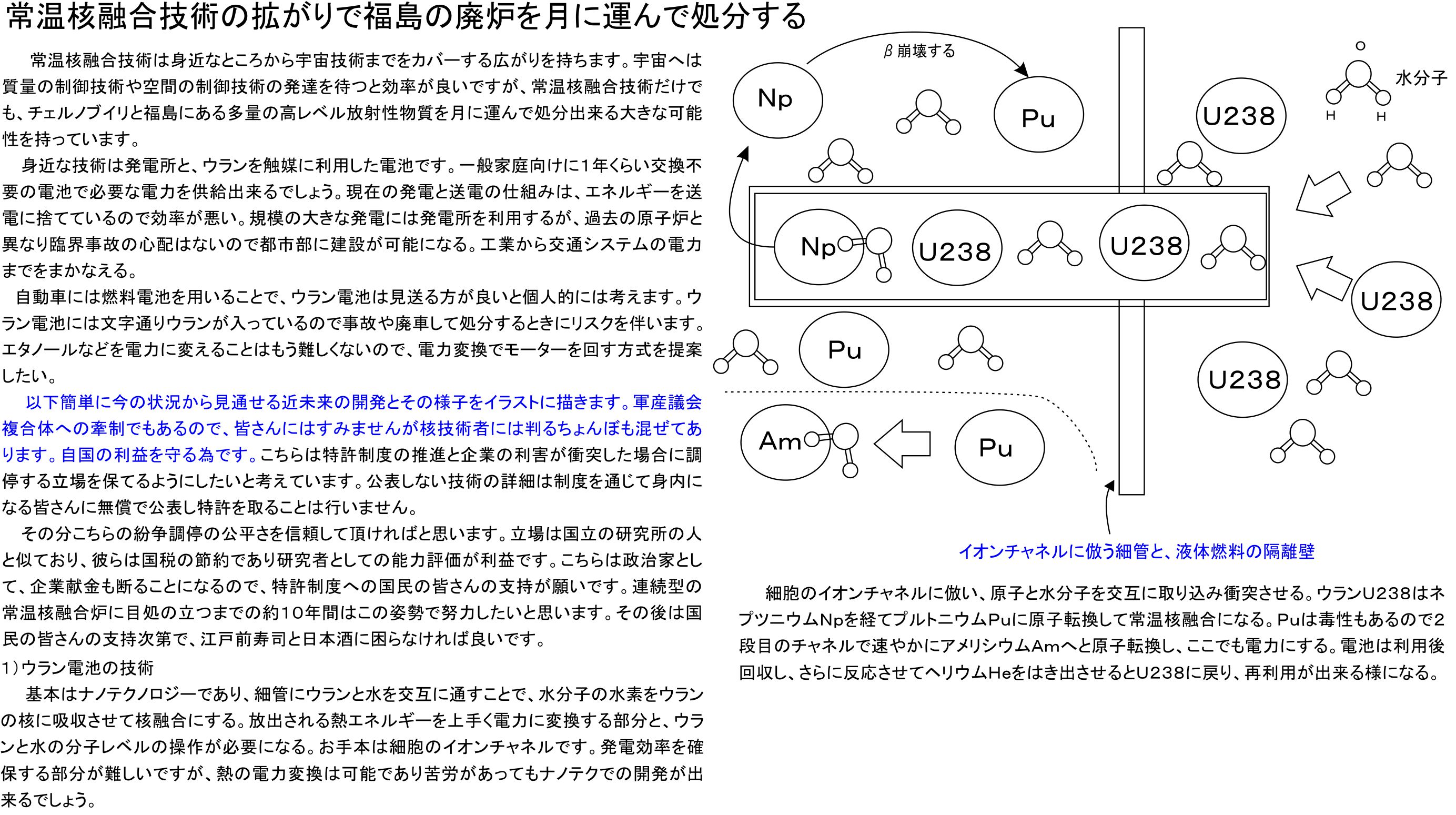 細胞のイオンチャネルに倣い、ナノテクの細管に原子と水分子を交互に取り込み衝突させる。ウランU238はネプツニウムNpを経てプルトニウムPuに原子転換して常温核融合になる。Puは毒性もあるので2段目のチャネルで速やかにアメリシウムAmへと原子転換し、ここでも電力にする。電池は利用後回収し、さらに反応させてヘリウムHeをはき出させるとU238に戻り、再利用が出来る様になる。