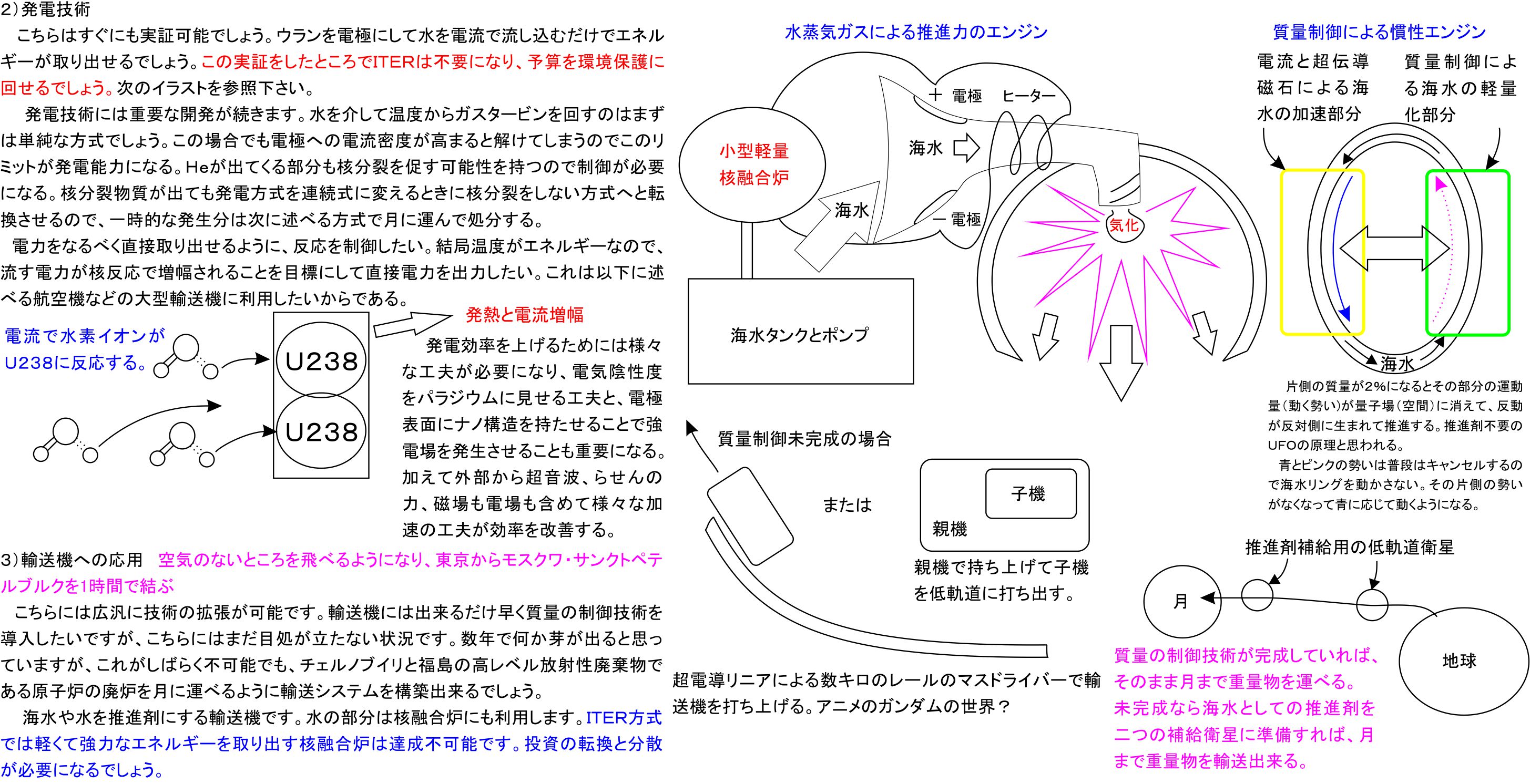 こちらはすぐにも実証可能でしょう。ウランを電極にして水を電流で流し込むだけでエネルギーが取り出せるでしょう。この実証をしたところでITERは不要になり、予算を環境保護に回せるでしょう。イラストを参照下さい。