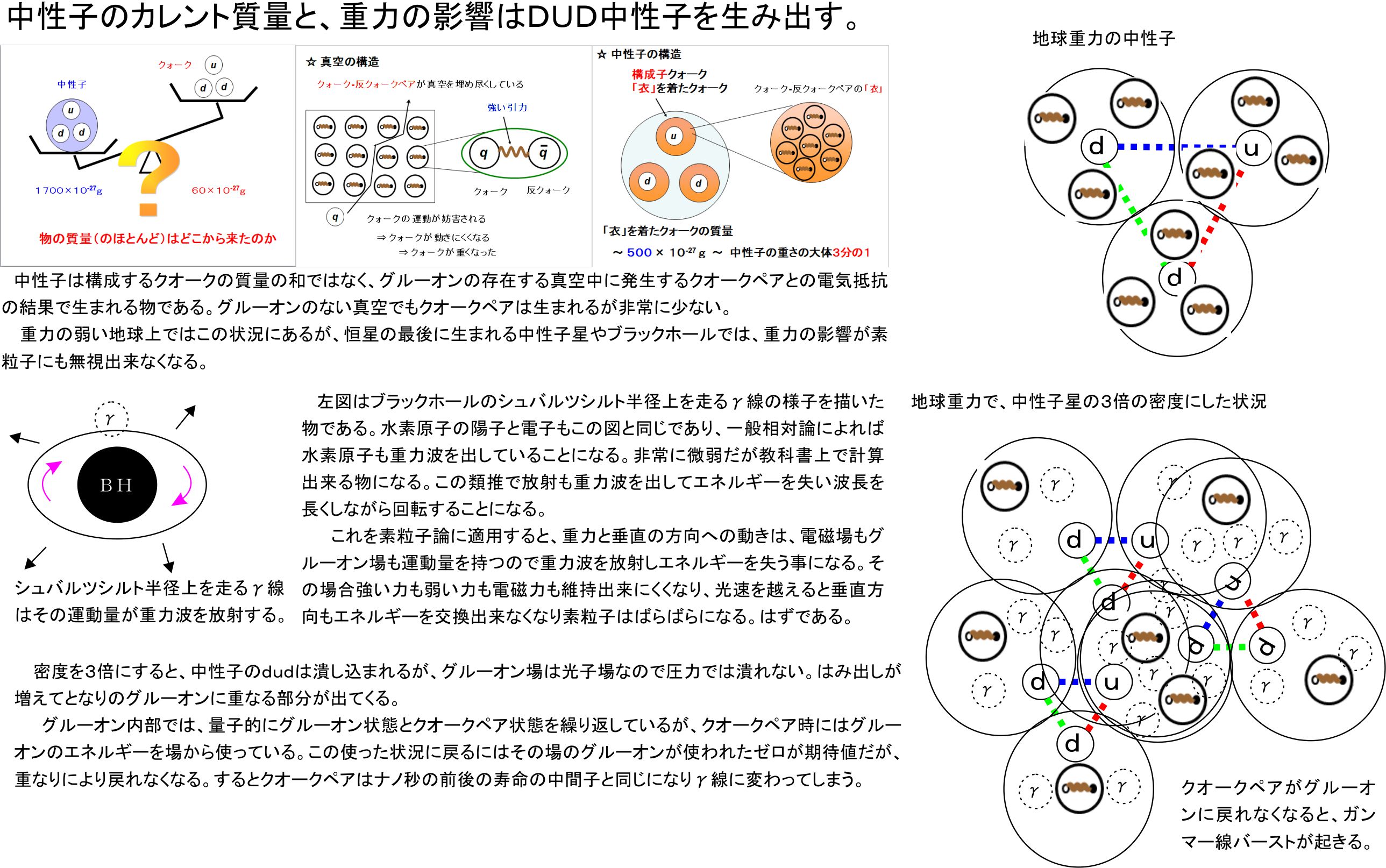 続いてこのDUD中性子の存在についての説明です。繰り返しになりますが、中性子の質量は構成するクオークの質量の和ではなく、グルーオンの存在する真空中に発生するクオークペアとの電気抵抗の結果で生まれる物です。グルーオンのない真空でもクオークペアは生まれるますが、非常に少ない確率なのです。