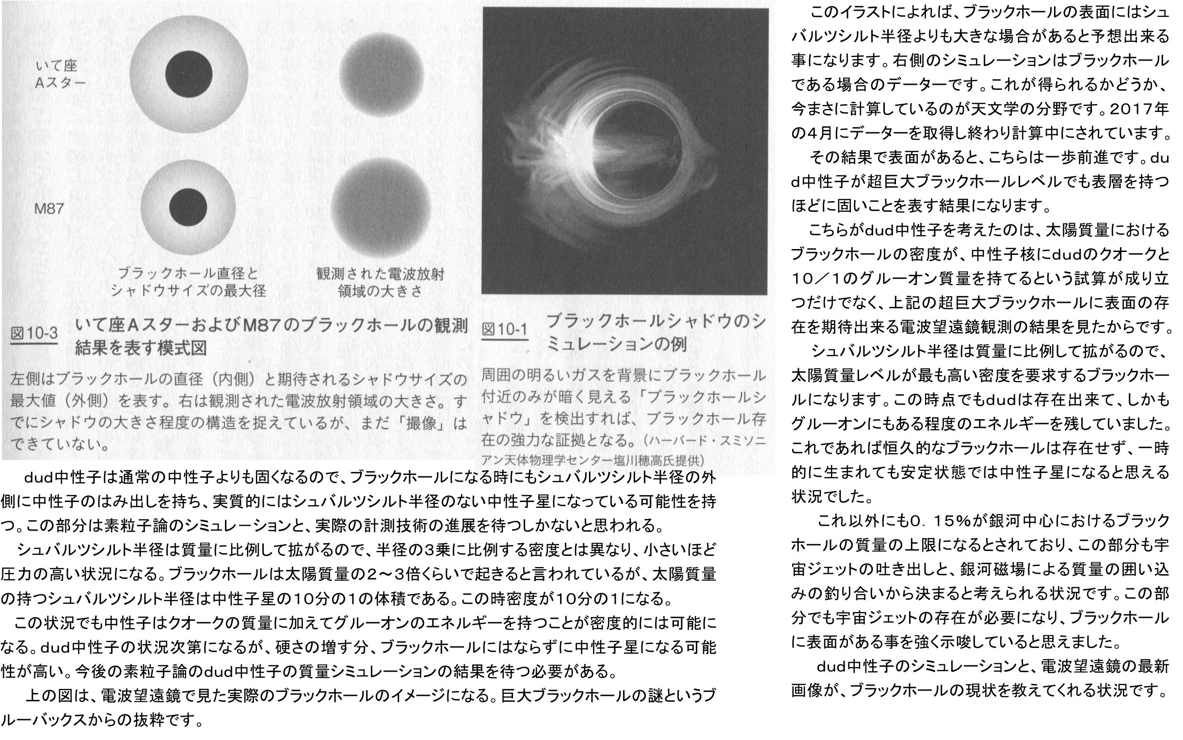 訳の分からない話だと思いますが、ここでの注目はクオークがブラックホールの内部でもその個性を失わないことと、その充満は中心の重力無限大の特異点をなくします。この部分が重要であり素粒子論の要請になるのです。加えて質量が増加し続ける問題も回避されます。