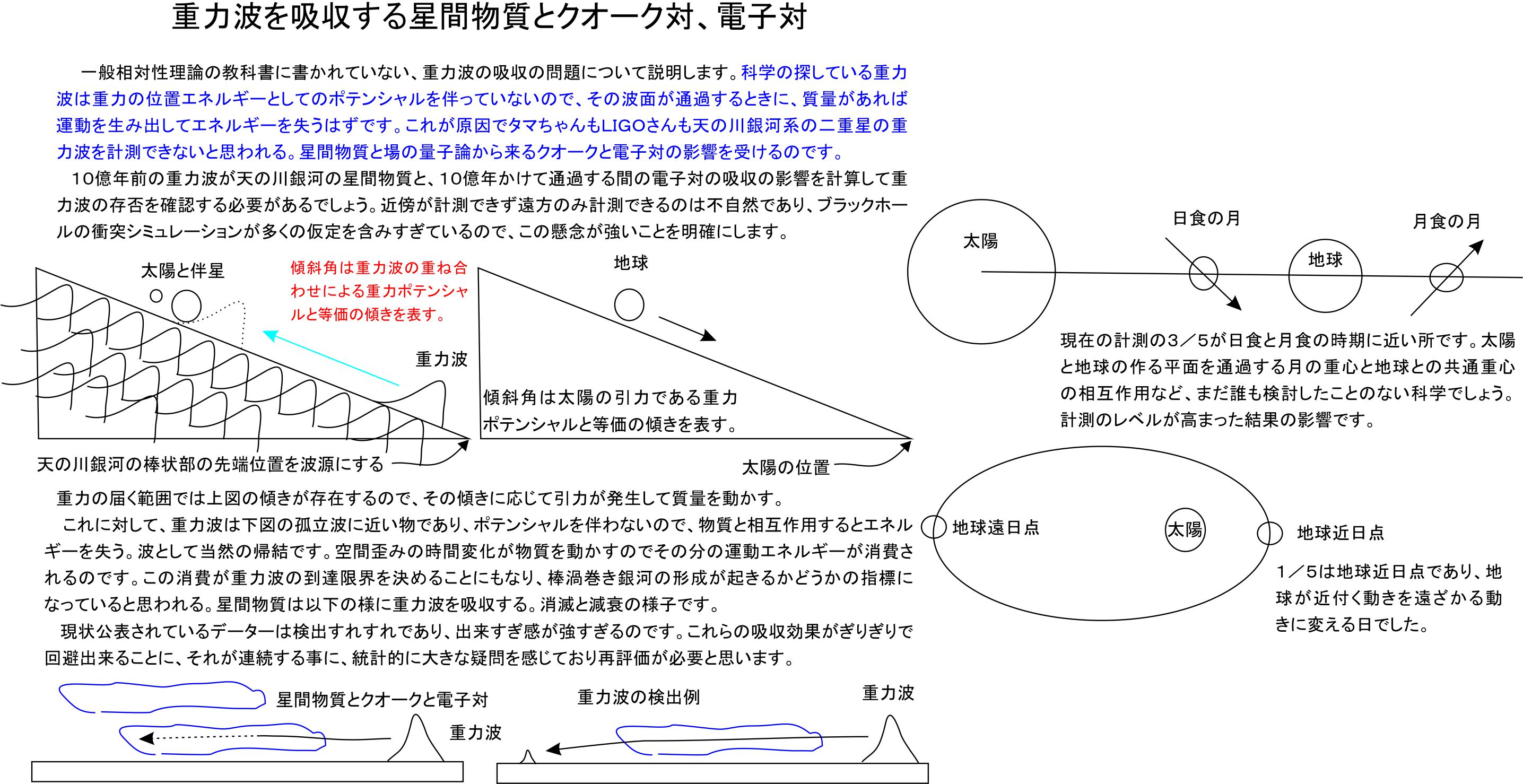 そして二重星の研究から明らかなように、重力波の放射により回転エネルギーは失われます。この効果はイラストに図示しますが、重力を時間と共に減らしてゆく効果です。斥力としてのダークマターを必要とせず、数式上関連するダークマターを約2倍分以上減らすことになります。