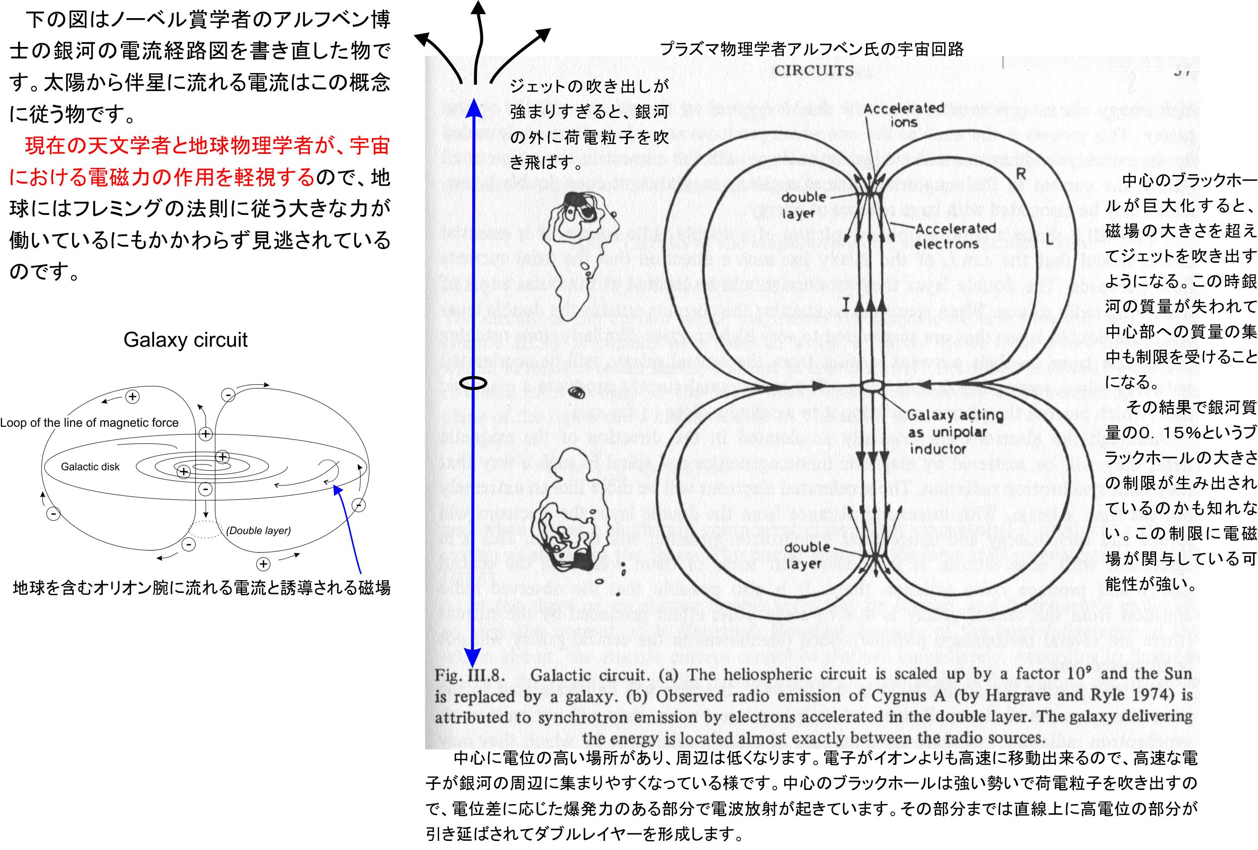 これ以外にも0.15%が銀河中心におけるブラックホールの質量の上限になるとされており、この部分も宇宙ジェットの吐き出しと、銀河磁場による質量の囲い込みの釣り合いから決まると考えられる状況です。この部分でも宇宙ジェットの存在が必要になり、ブラックホールに表面がある事を強く示唆していると思えました。