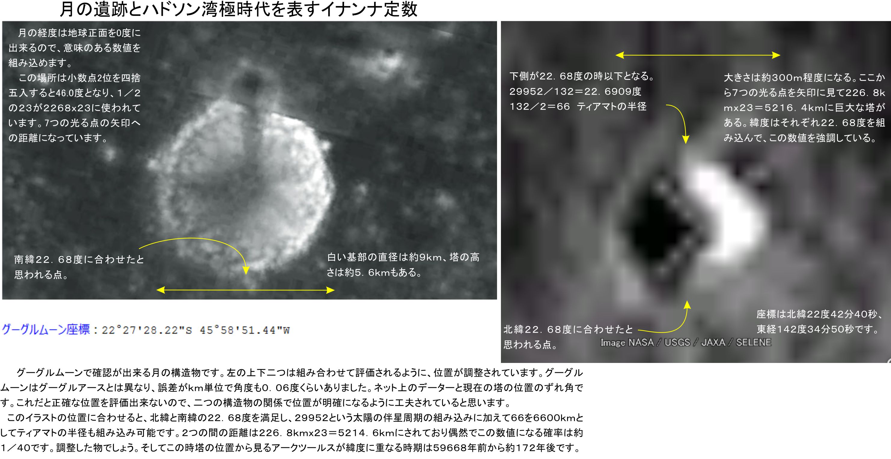 59496年前 月にモニュメントを作成して残し、地球の自転周期が安定したことと、文明の存続と新しい地球の自転周期の数値をイナンナ数として月に刻んでいる。当時の地球の歴史を残す作業だった。