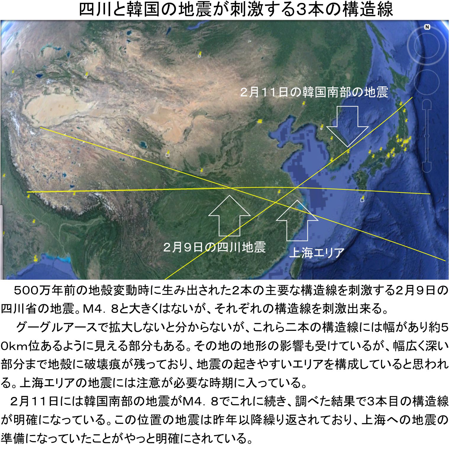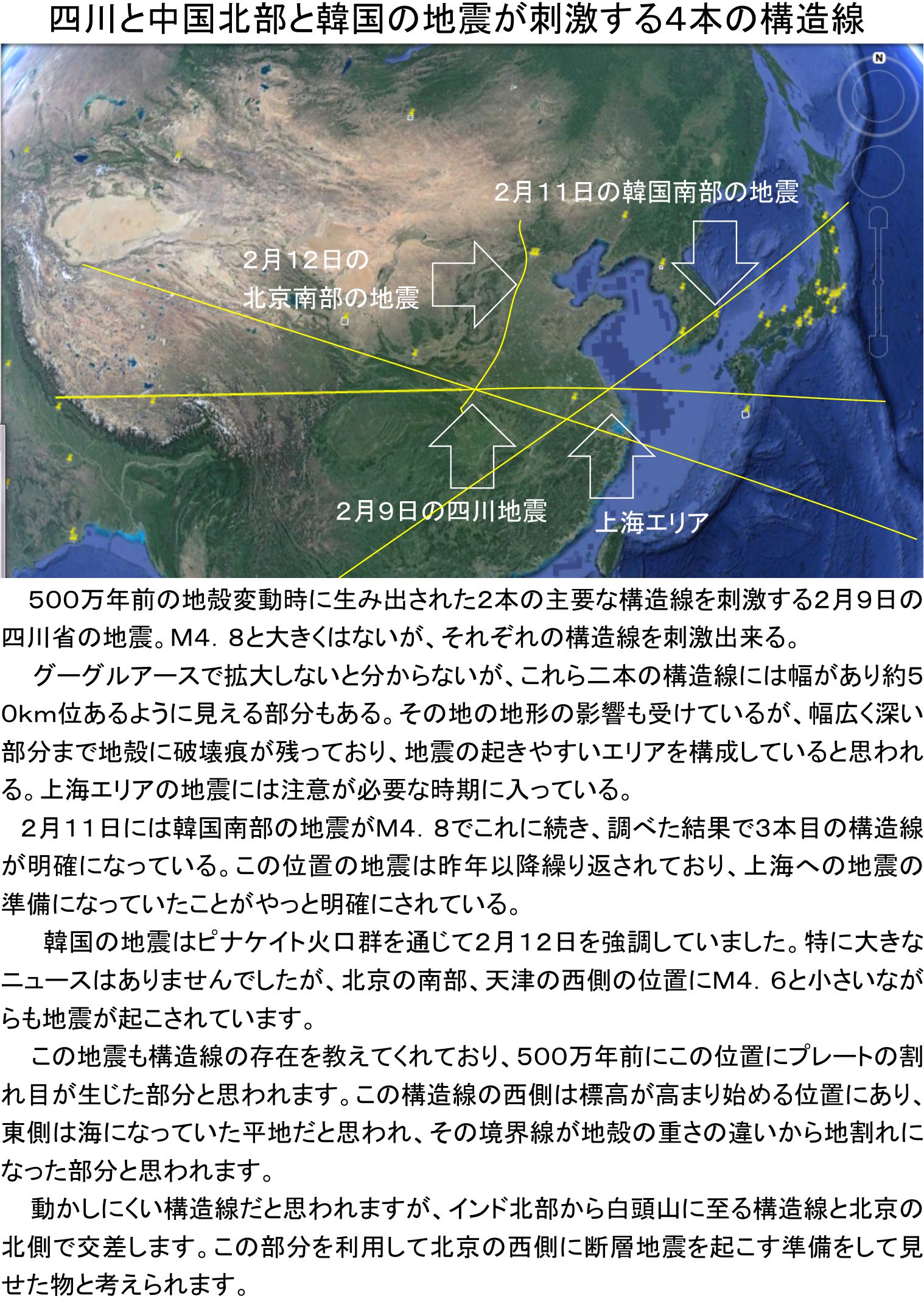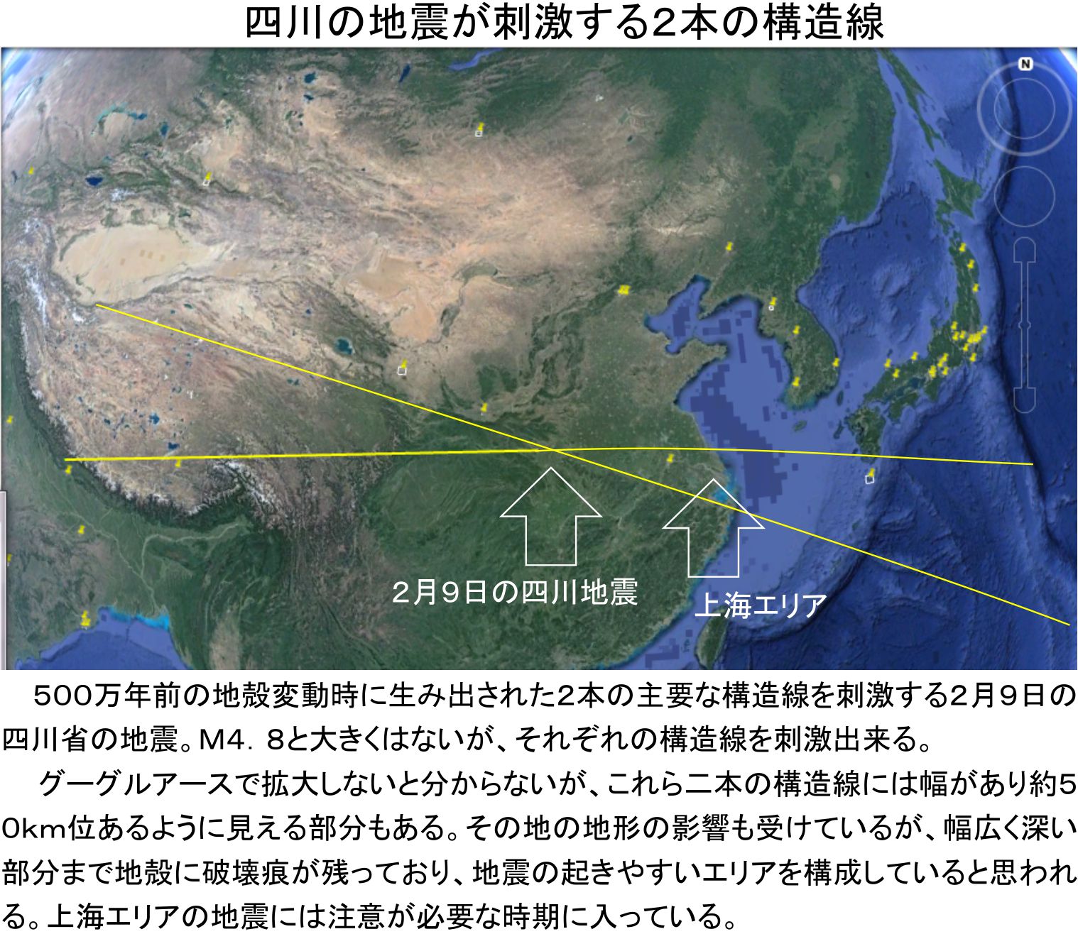 四川省の地震はイラストを添えて説明します。この地震の起きた位置は上海エリアの南北を通る構造線の交点です。地震のエネルギーはインド亜大陸がユーラシア大陸に押されている部分のエネルギーであり、上海での地震を起こす上での準備であり大きな牽制にもなるでしょう。