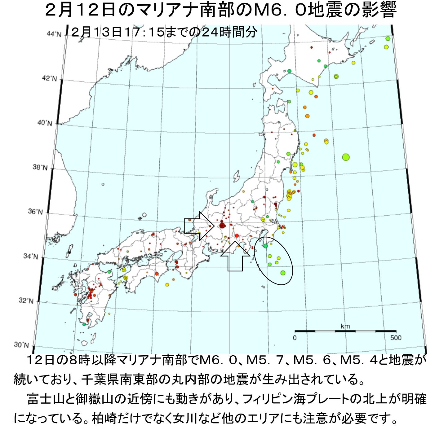 千葉県の南東沖で少し深い地震が続いており、マリアナ南部の地震の影響を検討していました。この地震後に富士山と御嶽山の近傍でも地震が続いており、フィリピン海プレートの北上の動きは明確です。