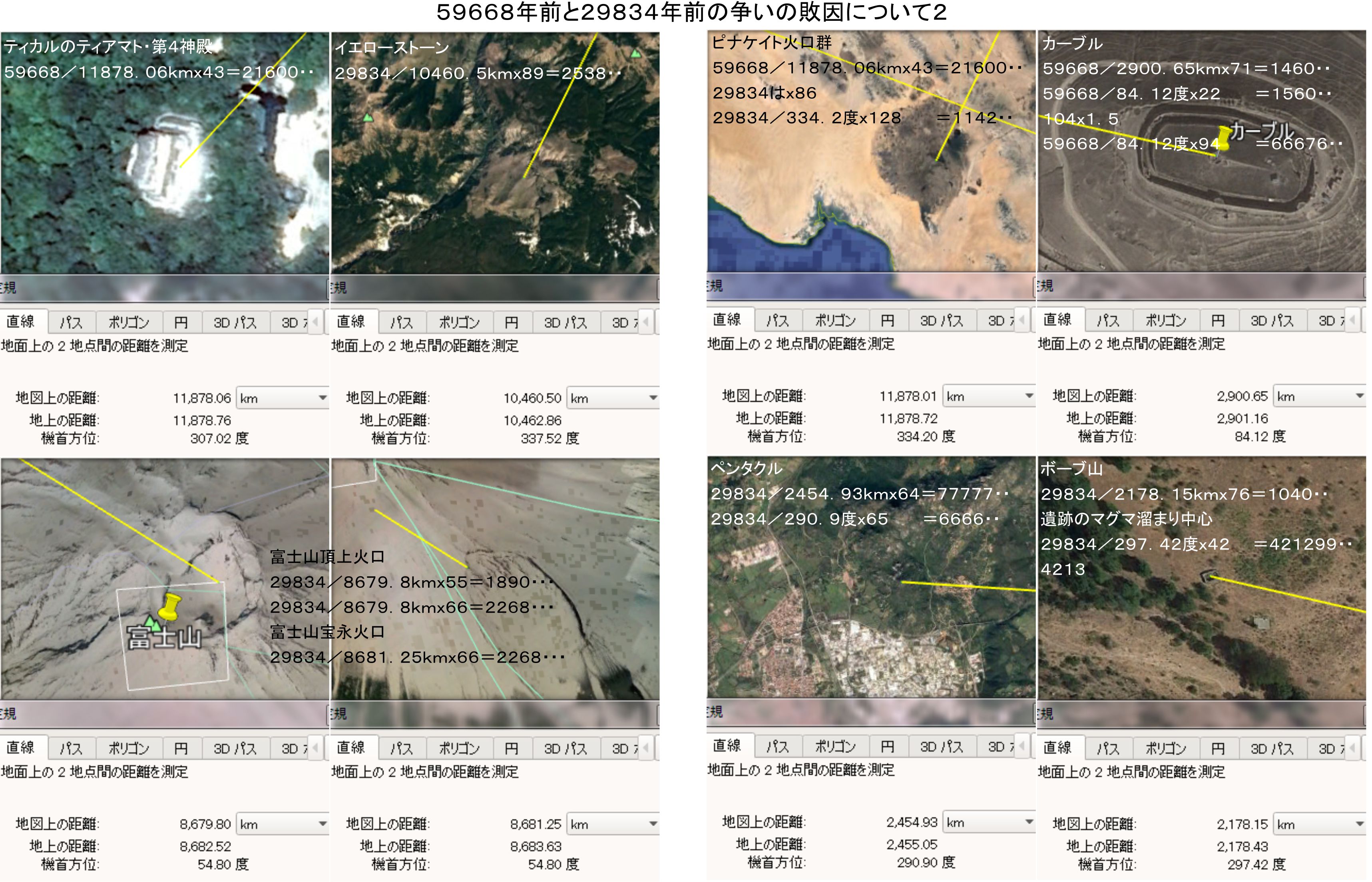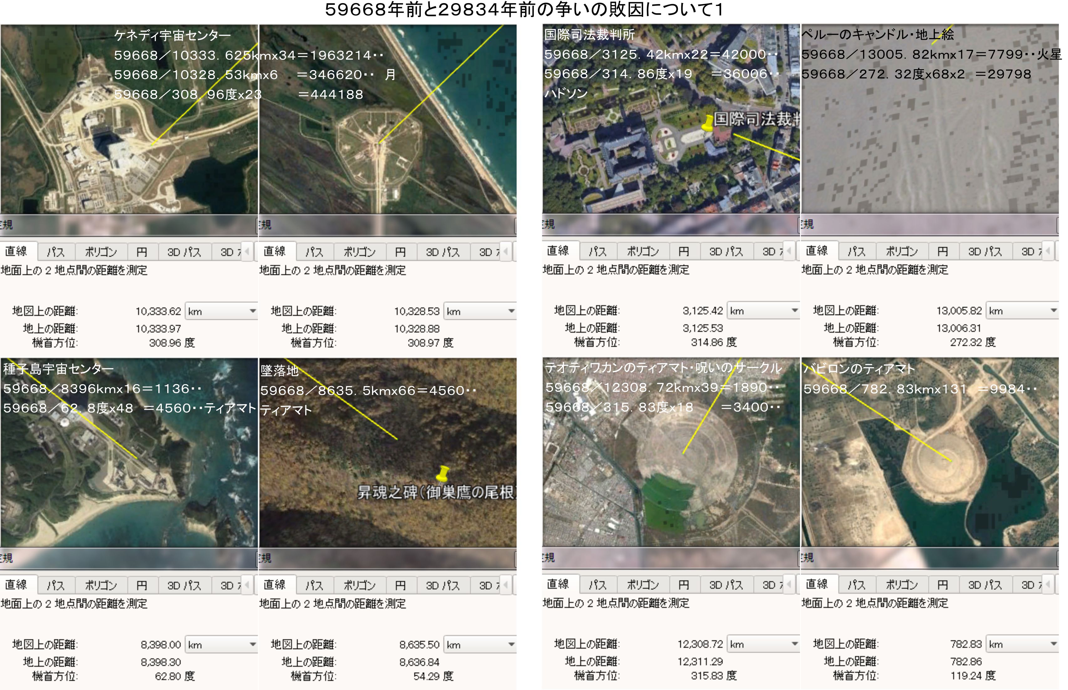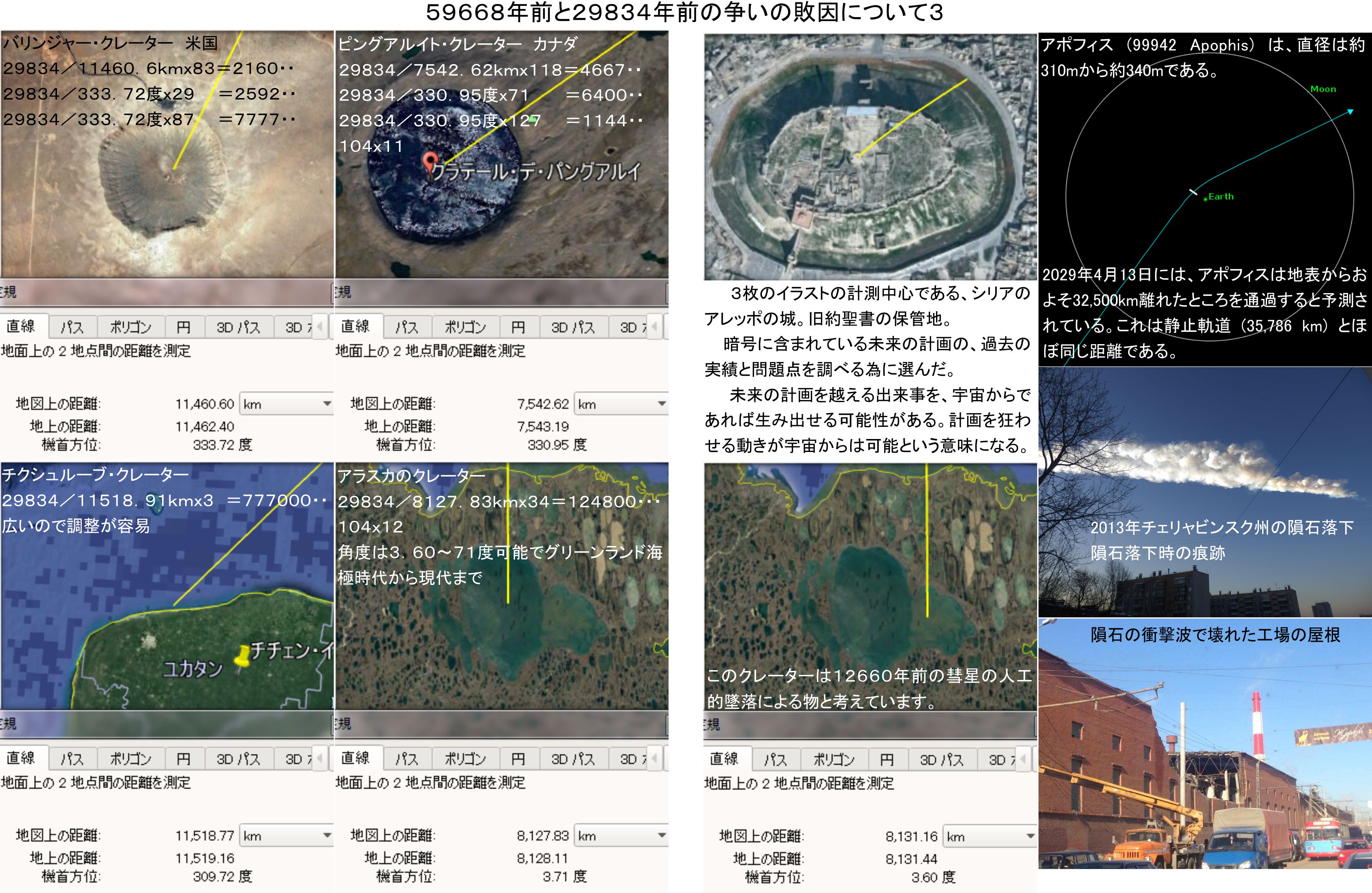 続きはこの結論を得ることになった遺跡への組み込みです。暗号の保存場所であるシリアのアレッポの城を計測の中心に選び、宇宙や自然を代表する場所、隕石につながる場所調べています。その結果、59668年前には宇宙が、29834年前には一部の自然が、あとは隕石の関連にも組み込みを多数確認することが出来ました。