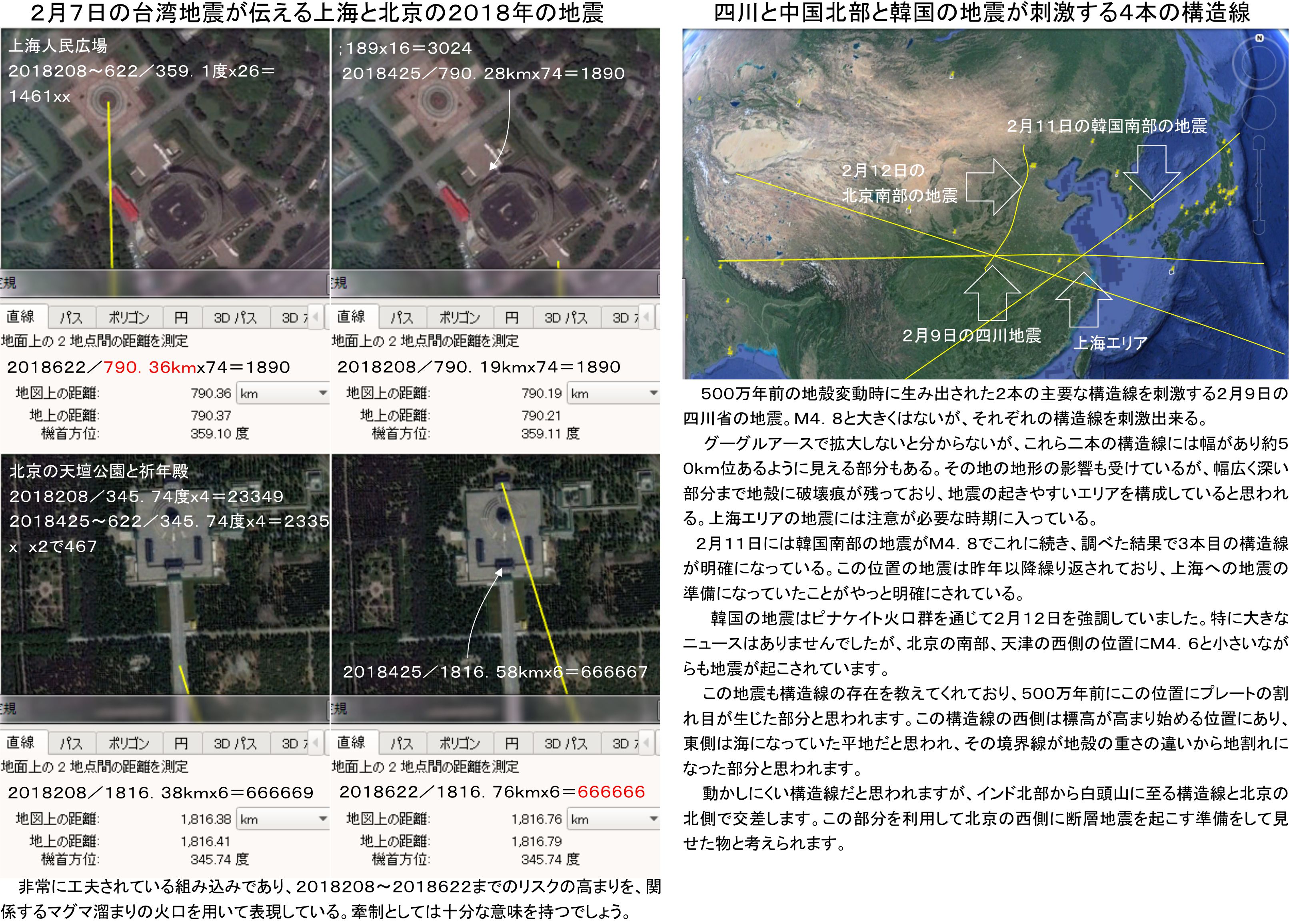 こちらの地震の科学としては、米国にも中国にも震災級の地震を起こすエネルギーは溜まってきていると思える所です。その地震の仕組みをどの様にするか、動かす構造線を教えるなどまでしているのです。時期は2月8日から4月25日になっており、中国では6月22日まで延びる可能性が2月6日くらいまでに明確になっている部分です。