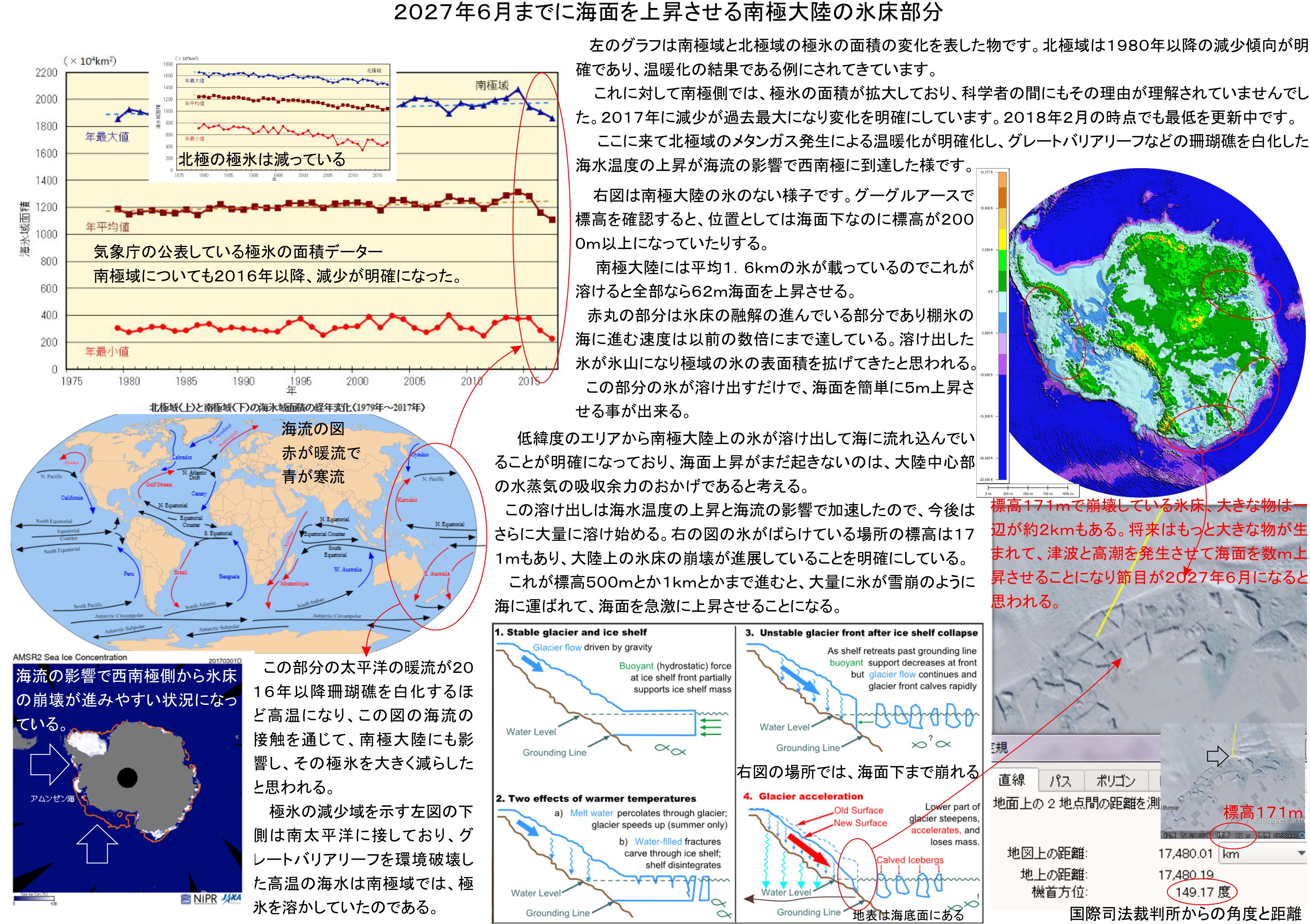 低緯度のエリアから南極大陸上の氷が溶け出して海に流れ込んでいることが明確になっており、海面上昇がまだ起きないのは、大陸中心部の水蒸気の吸収余力のおかげであると考えています。この溶け出しは海水温度の上昇と海流の影響で加速したので、今後はさらに大量に溶け始める。右の図の氷がばらけている場所の標高は171mもあり、大陸上の氷床の崩壊が進展していることを明確にしている。