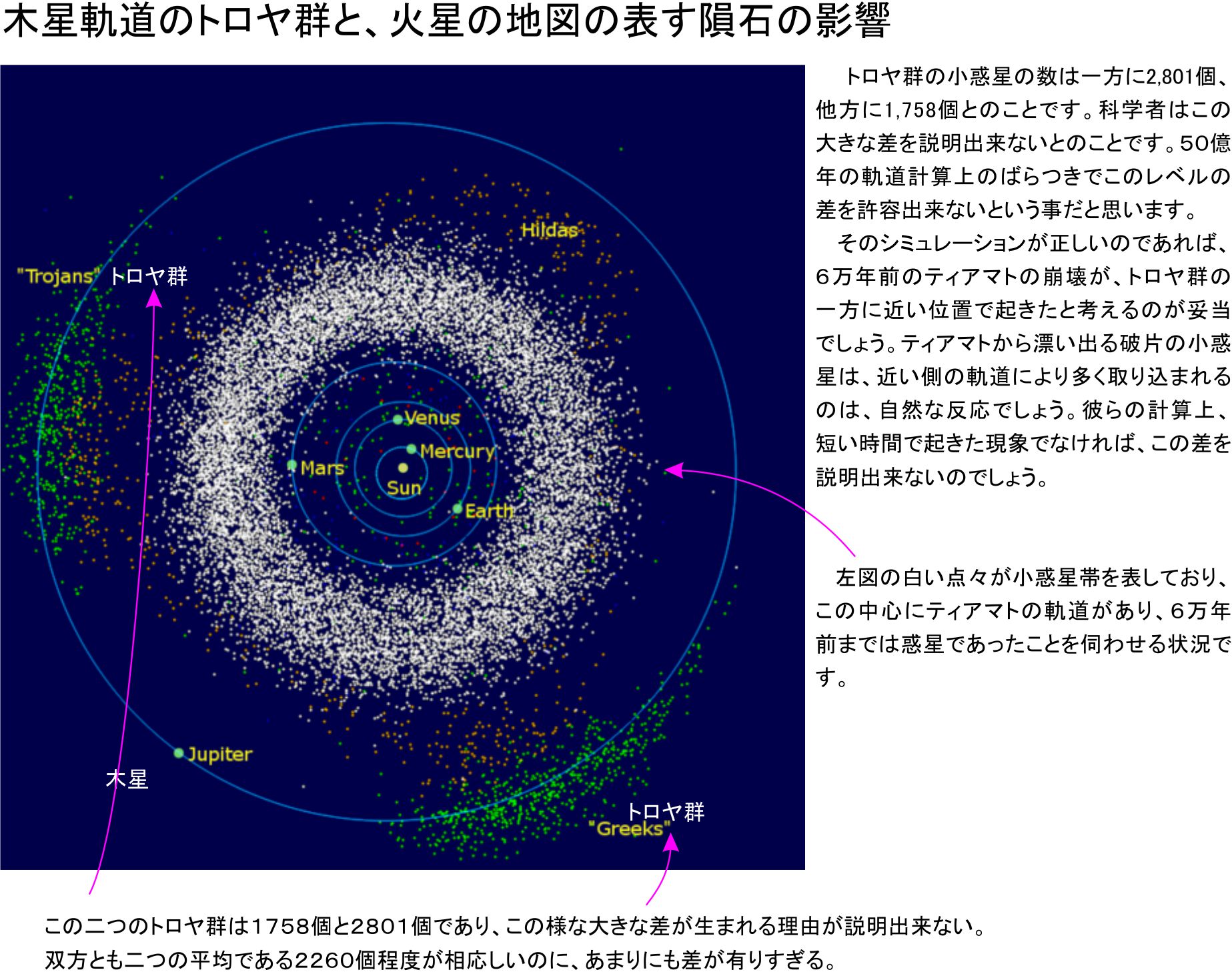 これに対して、トロヤ群と呼ばれる小惑星は、その時の流れに反する情報を持っています。トロヤ群の二カ所の安定軌道には統計的に同数の小惑星が存在すべきですが、なぜか一方が多いのです。これを説明する簡単な理由は、比較的近い時期に惑星の崩壊があって小惑星が生まれて、近い方の安定軌道に多数が捕まったという事です。6万年前であれば現実的なのです。