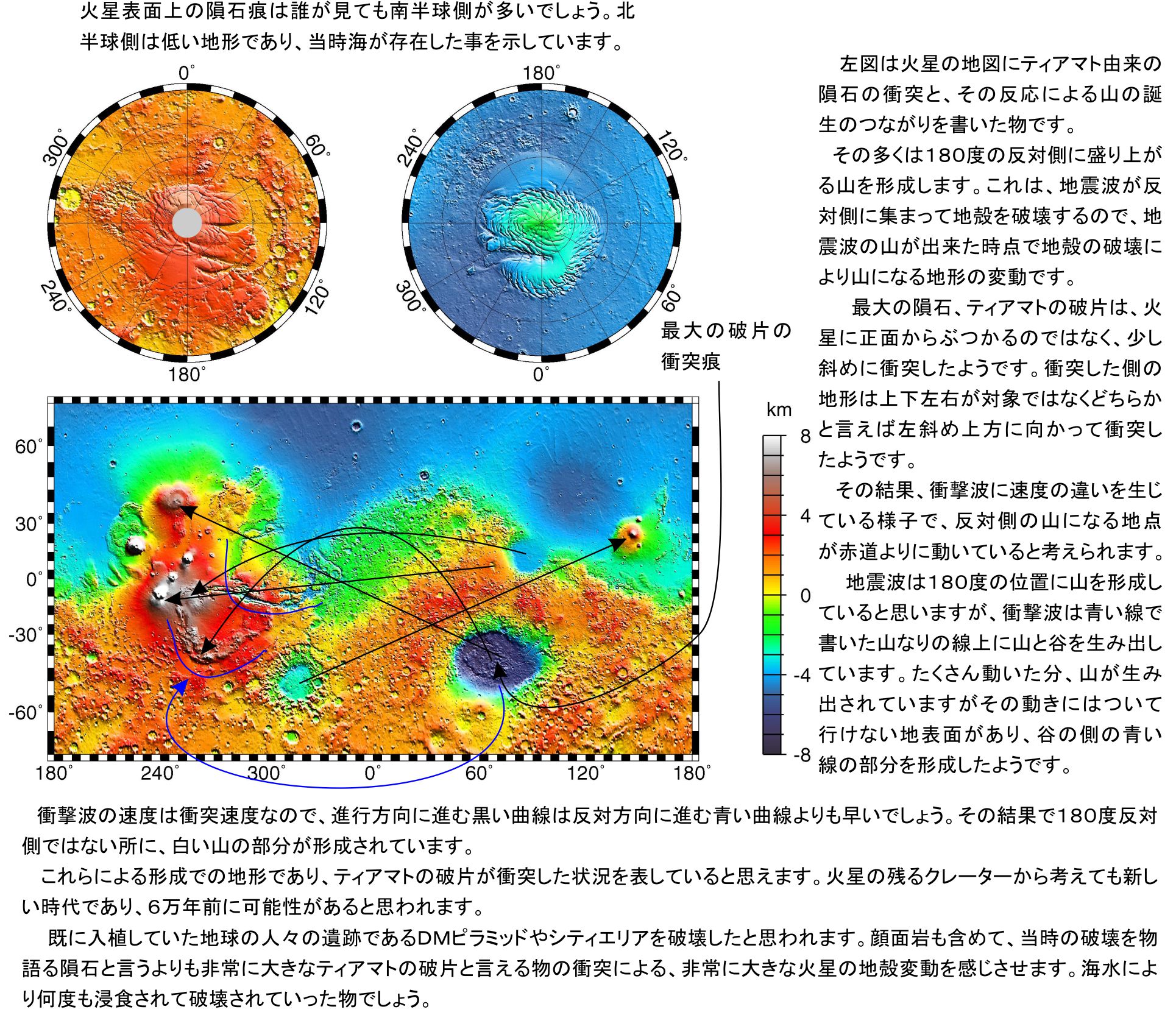火星の衝突痕も、普通の方には分からないですが、地形として異常なのです。180度の反対側に影響が及ぶのは、強い衝突の影響であると考えることが合理的です。加えてその時に生まれる衝撃波に準じた地形まで残されているのです。